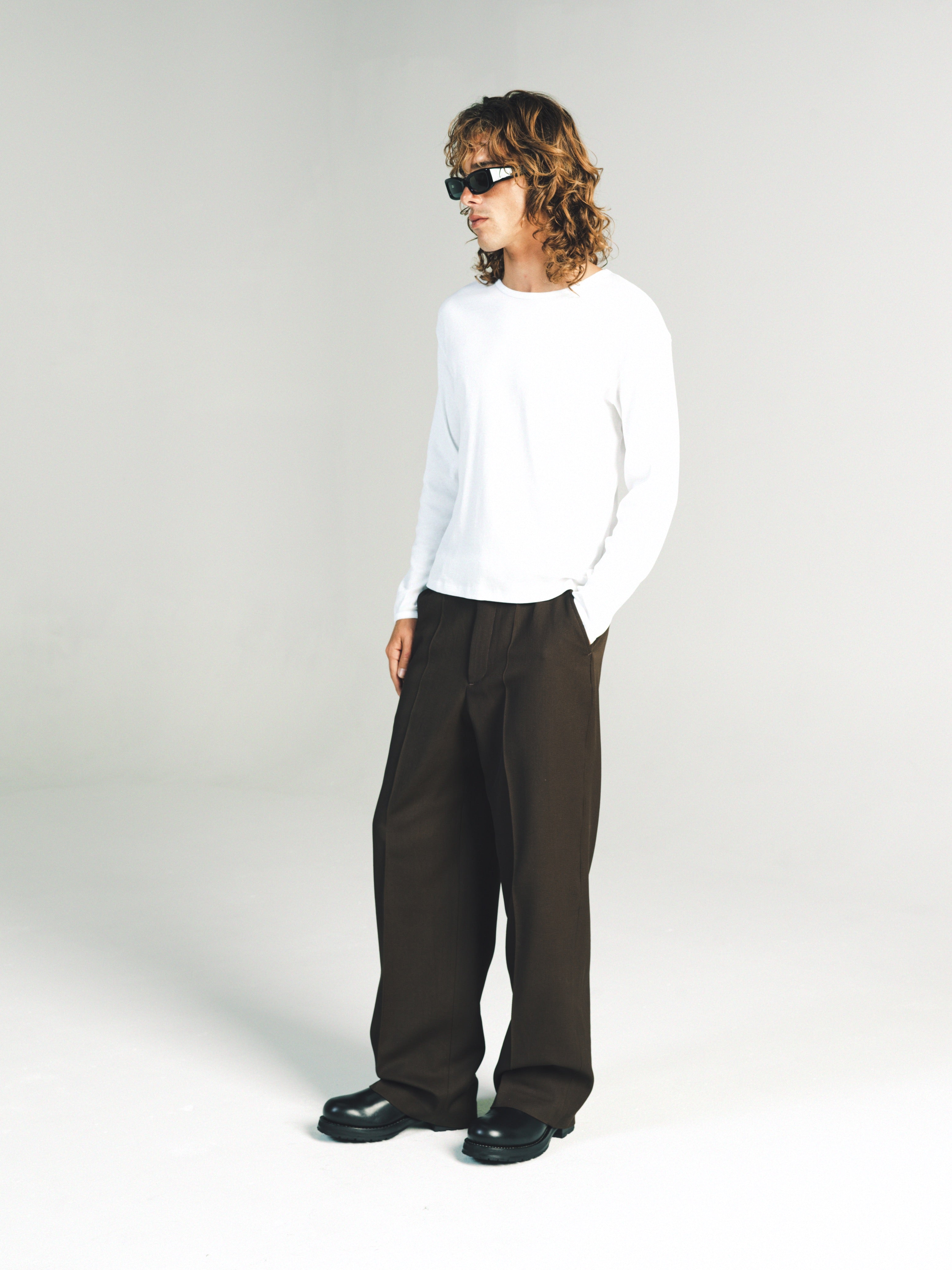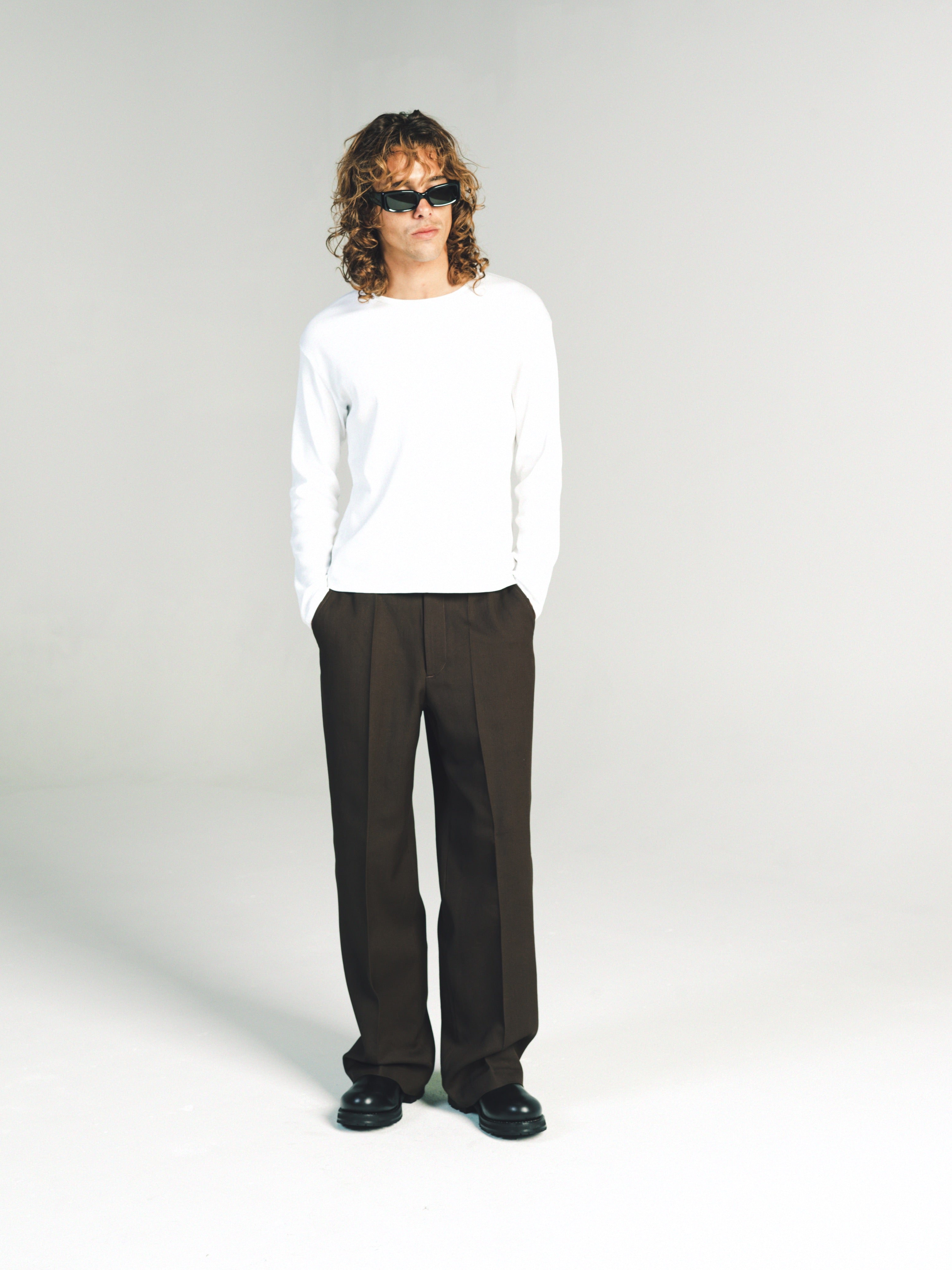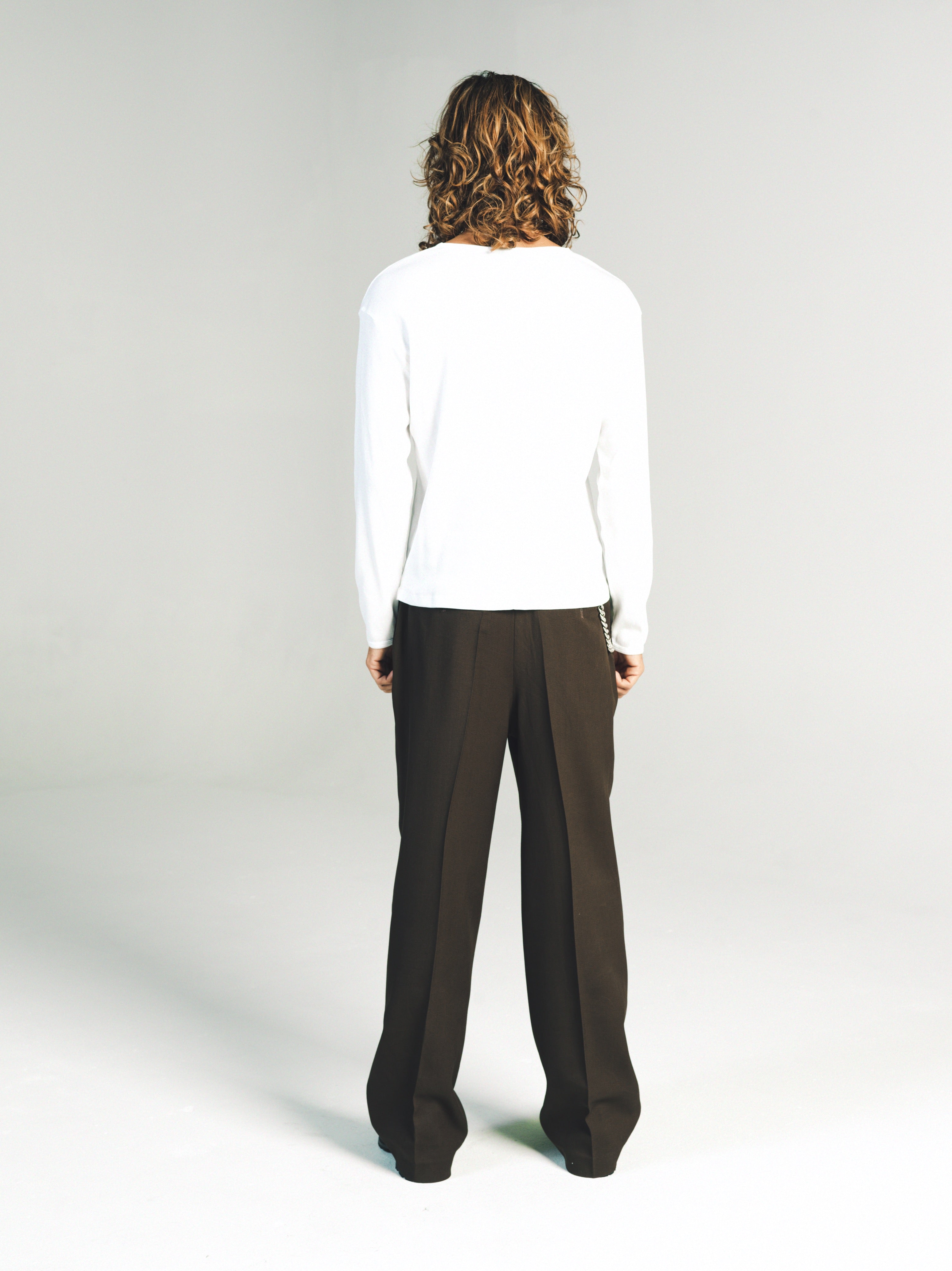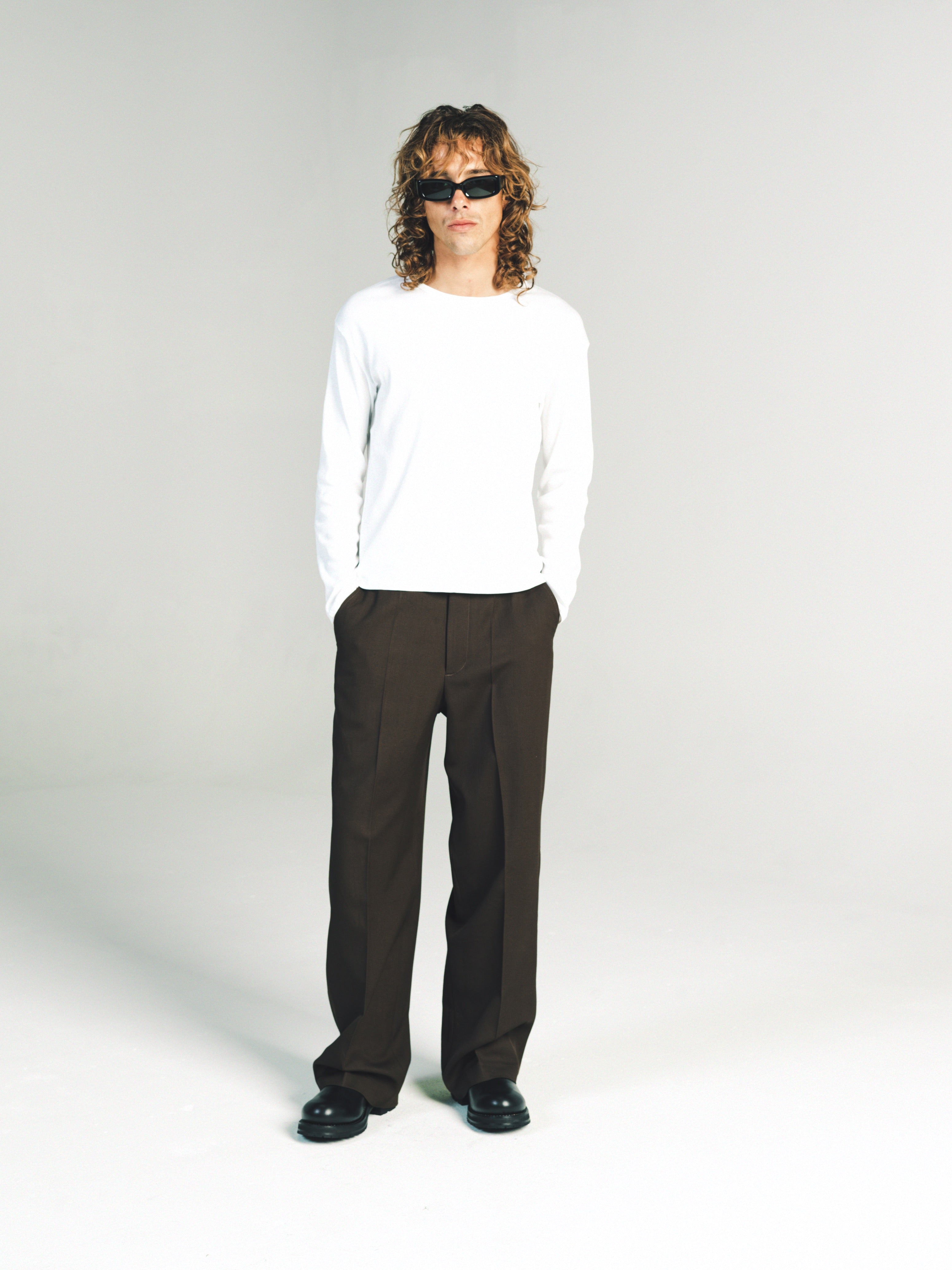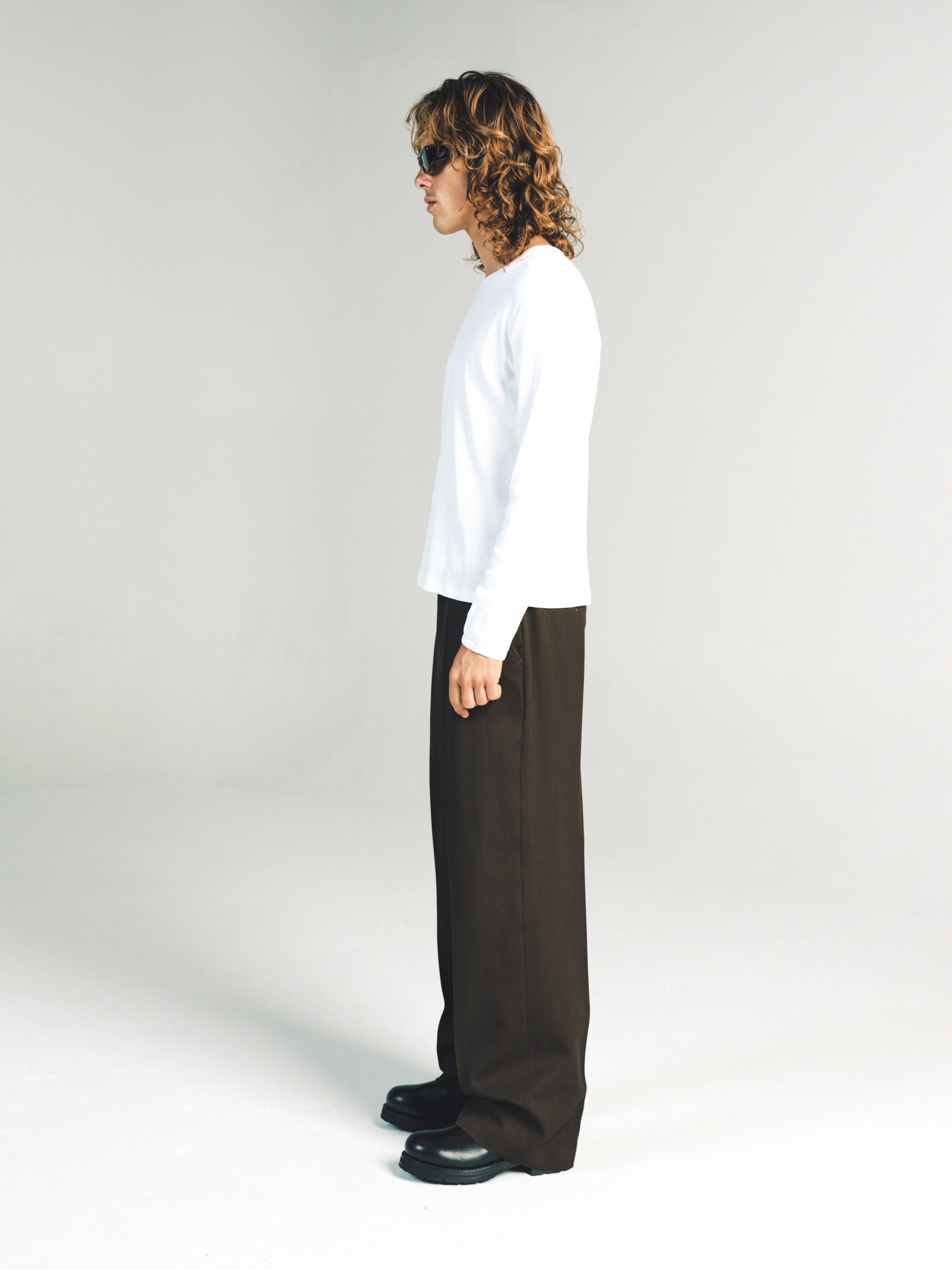 Ribbed Long sleeve T-Shirt. Slim relaxed fit. Wear it as a base layer. Size up for a baggy fit or size down for a tighter fit. Model is 5'11 and wears a Sz. M. Made in Portugal. It’s a T-shirt. Don’t blow it. If you’re a baller you can dry clean. If you care then wash in cold and hang dry then iron. If Your lazy just wash and dry. Any is acceptable. Its up to you to care for your own shit.