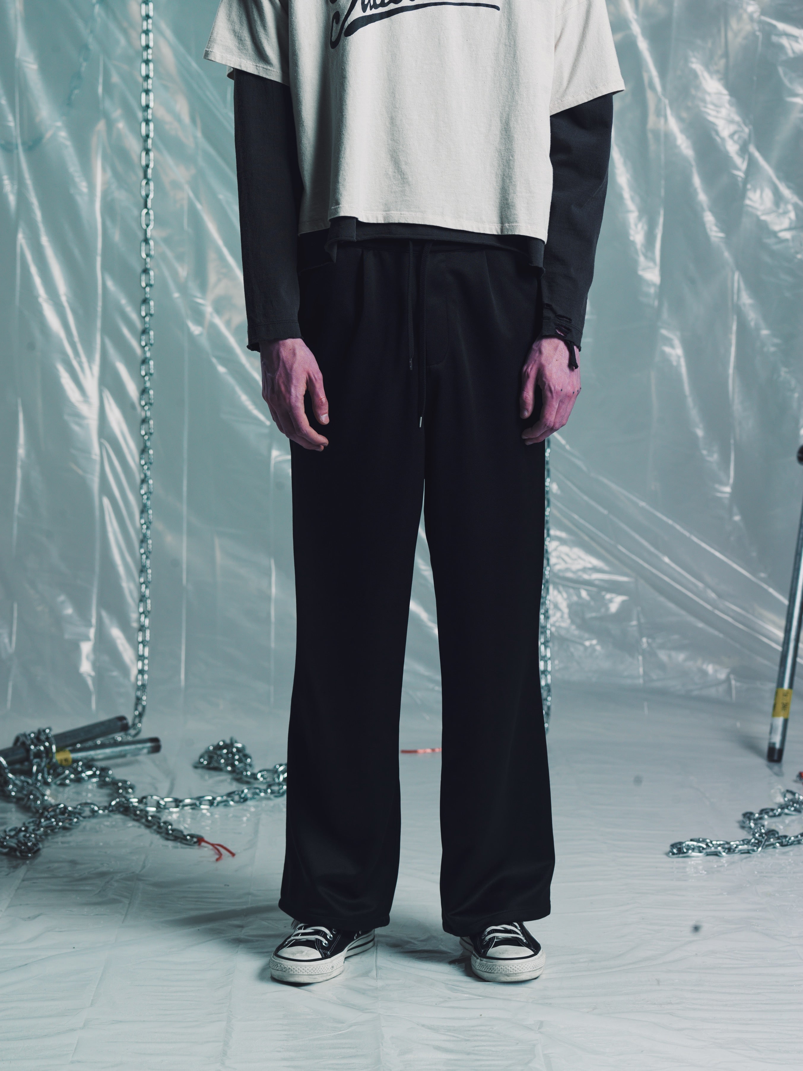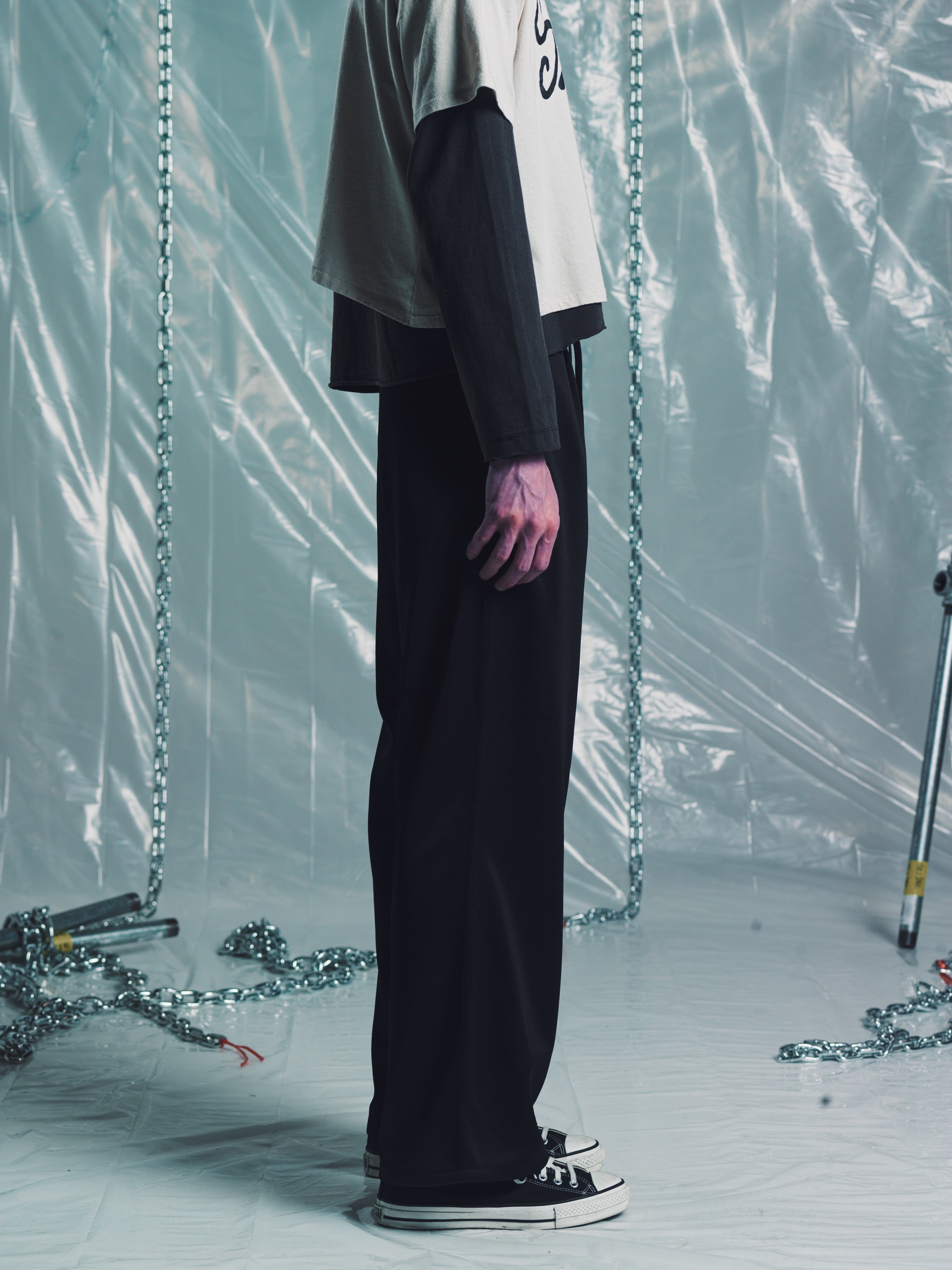 Elasticated waist band with draw cord on outside. Dual front/ side pockets . A casual upgrade to your classic chill pant. More of a wide leg track trouser without the trouser part. Relaxed fit with a small front pleat. Perfect for a grown up sweatpant replacement. Made in Japan. It’s a casual pant. Don’t blow it. If you’re a baller you can dry clean. If you care then wash in cold and hang dry then iron. If Your lazy just wash and dry. Any is acceptable. Its up to you to care for your own shit
