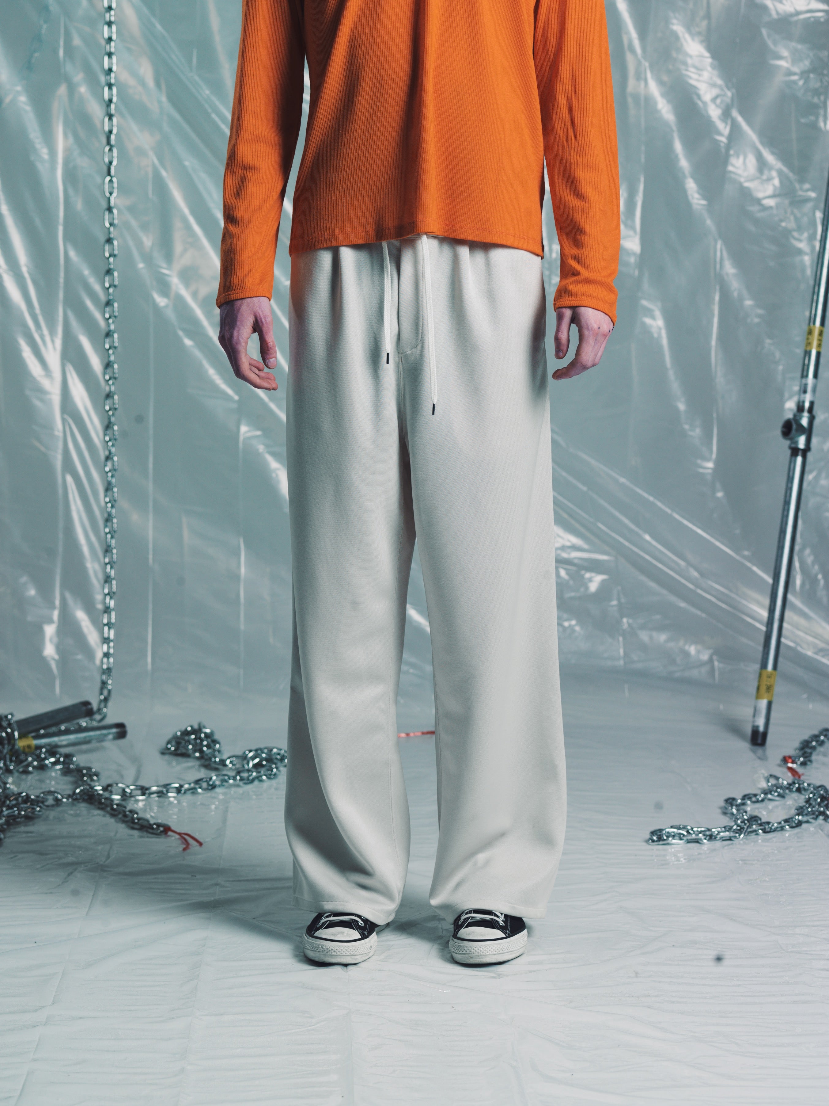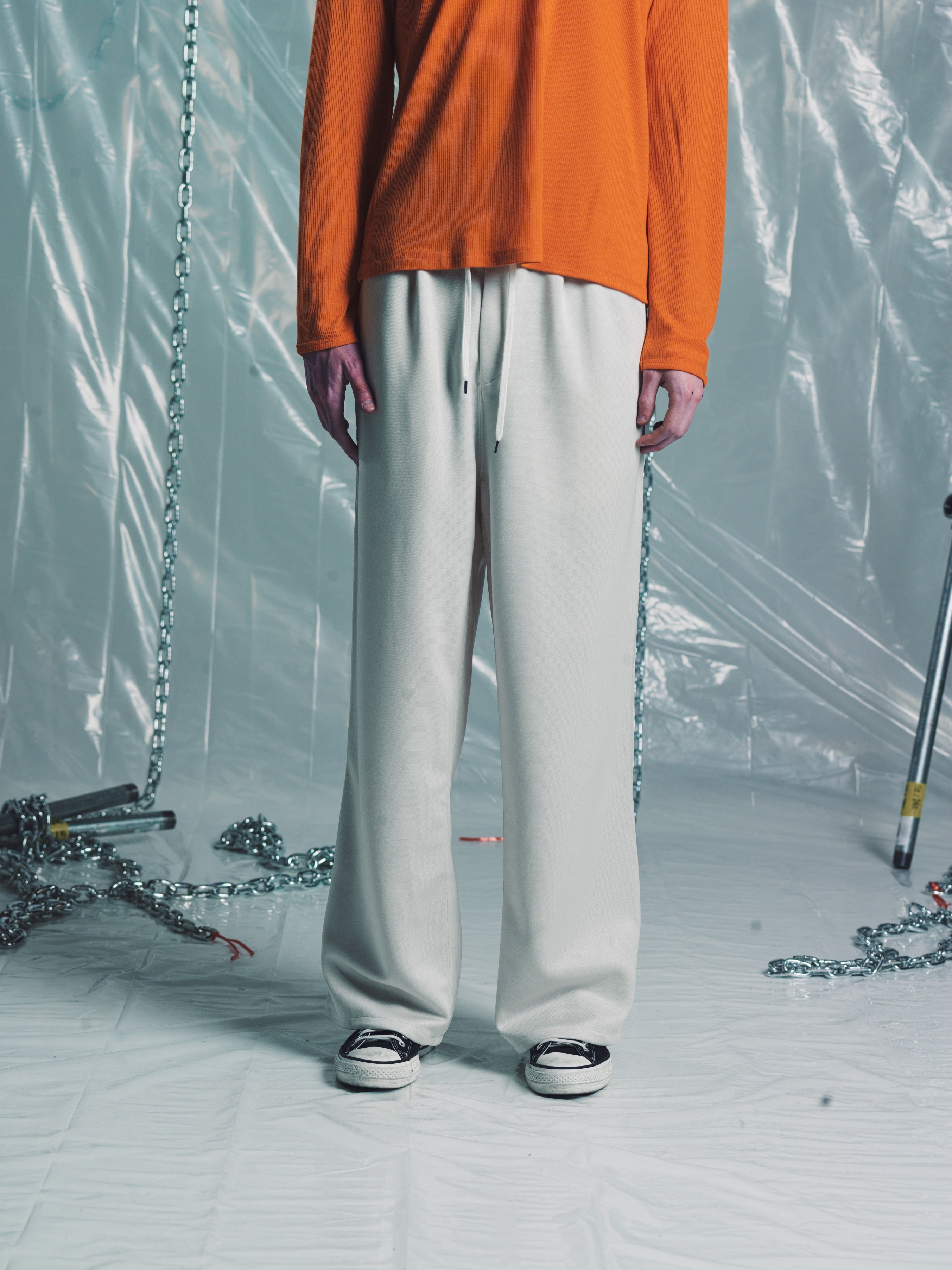 Elasticated waist band with draw cord on outside. Dual front/ side pockets . A casual upgrade to your classic chill pant. More of a wide leg track trouser without the trouser part. Relaxed fit with a small front pleat. Perfect for a grown up sweatpant replacement. Made in Japan. It’s a casual pant. Don’t blow it. If you’re a baller you can dry clean. If you care then wash in cold and hang dry then iron. If Your lazy just wash and dry. Any is acceptable. Its up to you to care for your own shit