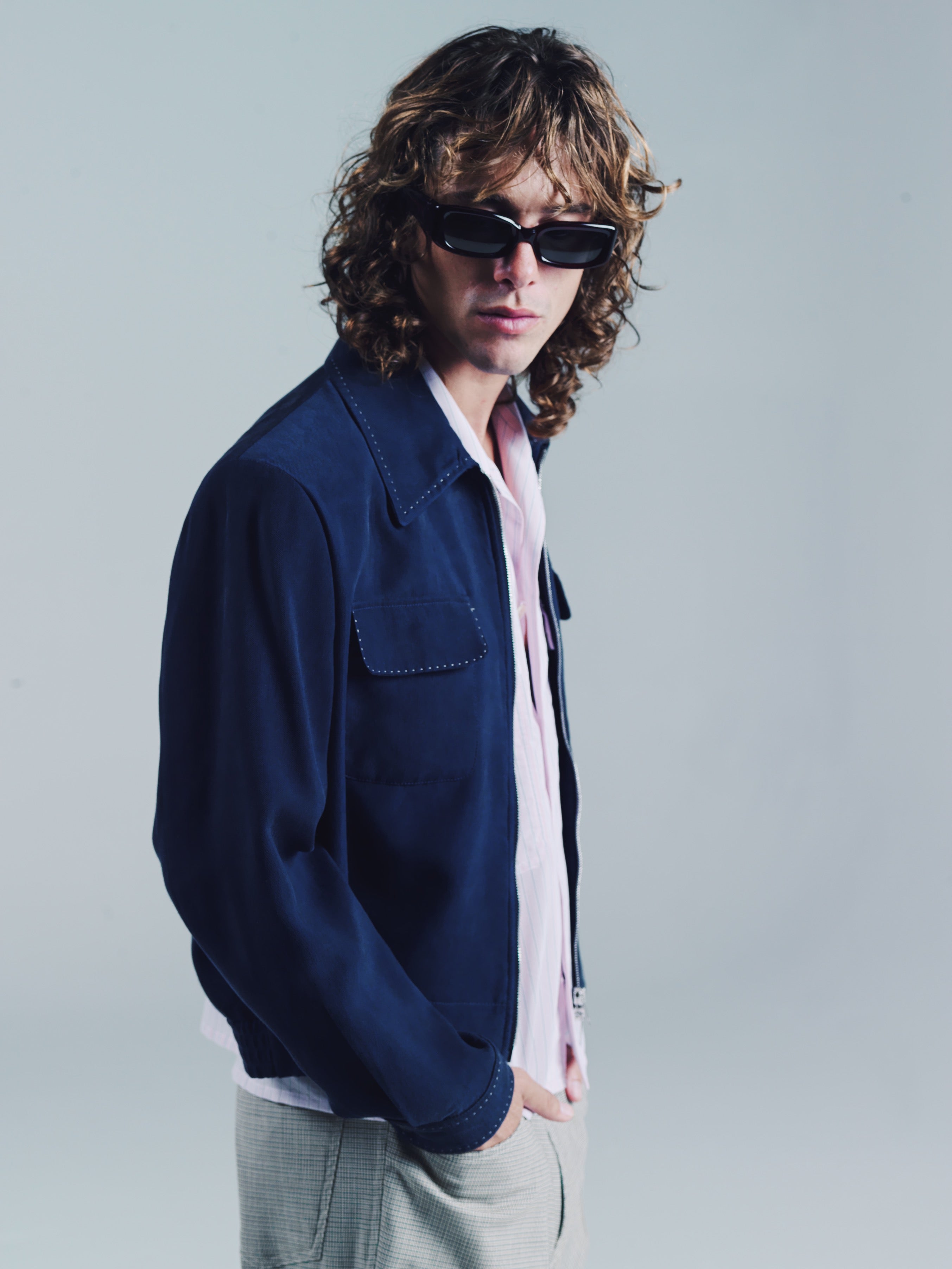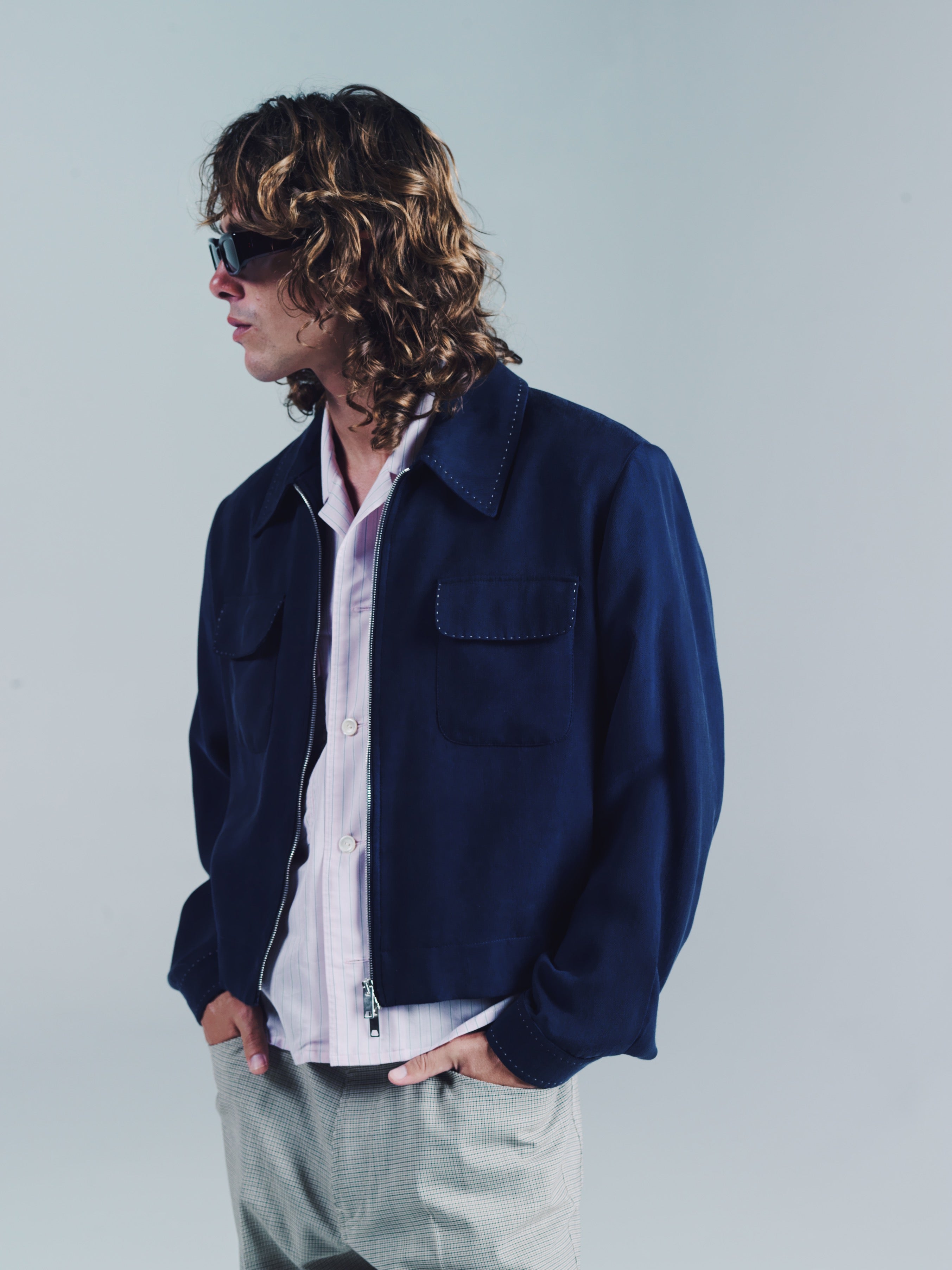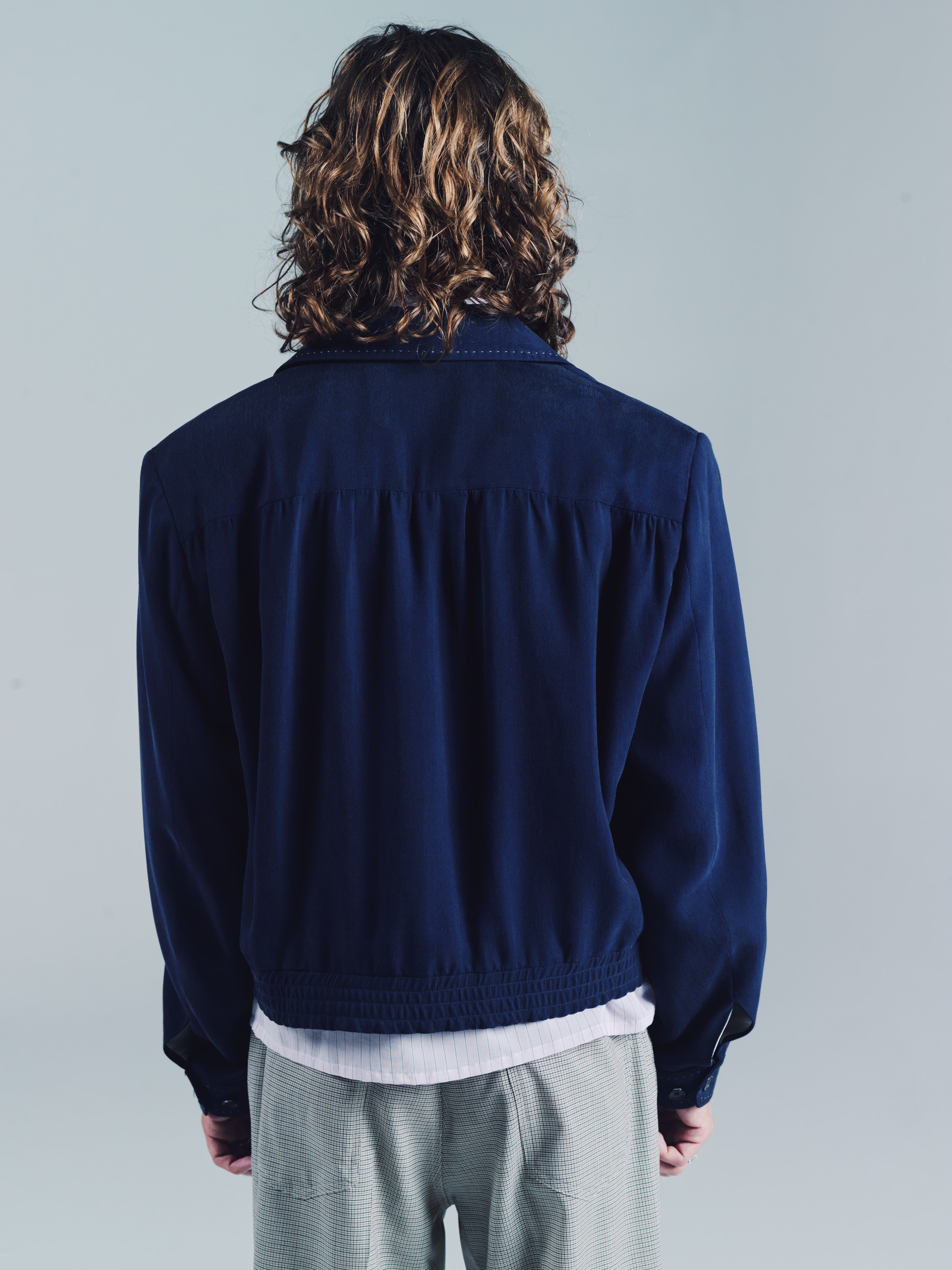 Zip Center front closure. Dual button closure at cuffs. Front chest Pockets. IMF stitching detail along collar and pocket flaps. Structured shoulders to give a shaper shape in the shoulder. Pleated back yolk. Self elasticized hem. Inside chest pockets including cell phone and ticket pockets. Riccagni Zipper. Washed Italian cupro/rayon blendStructured shoulder with a beautiful pleated back yolk in a soft washed fabric giving a very unique drape and vibe. Cropped fit. Best worn casually with a tank or t'shirt to keep it casual. Model is 5'11 ft. and wears a 48.Made in Italy. This is a stunt piece. To be worn with care and precision. Don’t crumble it up and let it sit on your bedroom chair. Take care of it. Hang it up after each wear to air out and keep it crispy. Dry Clean only.