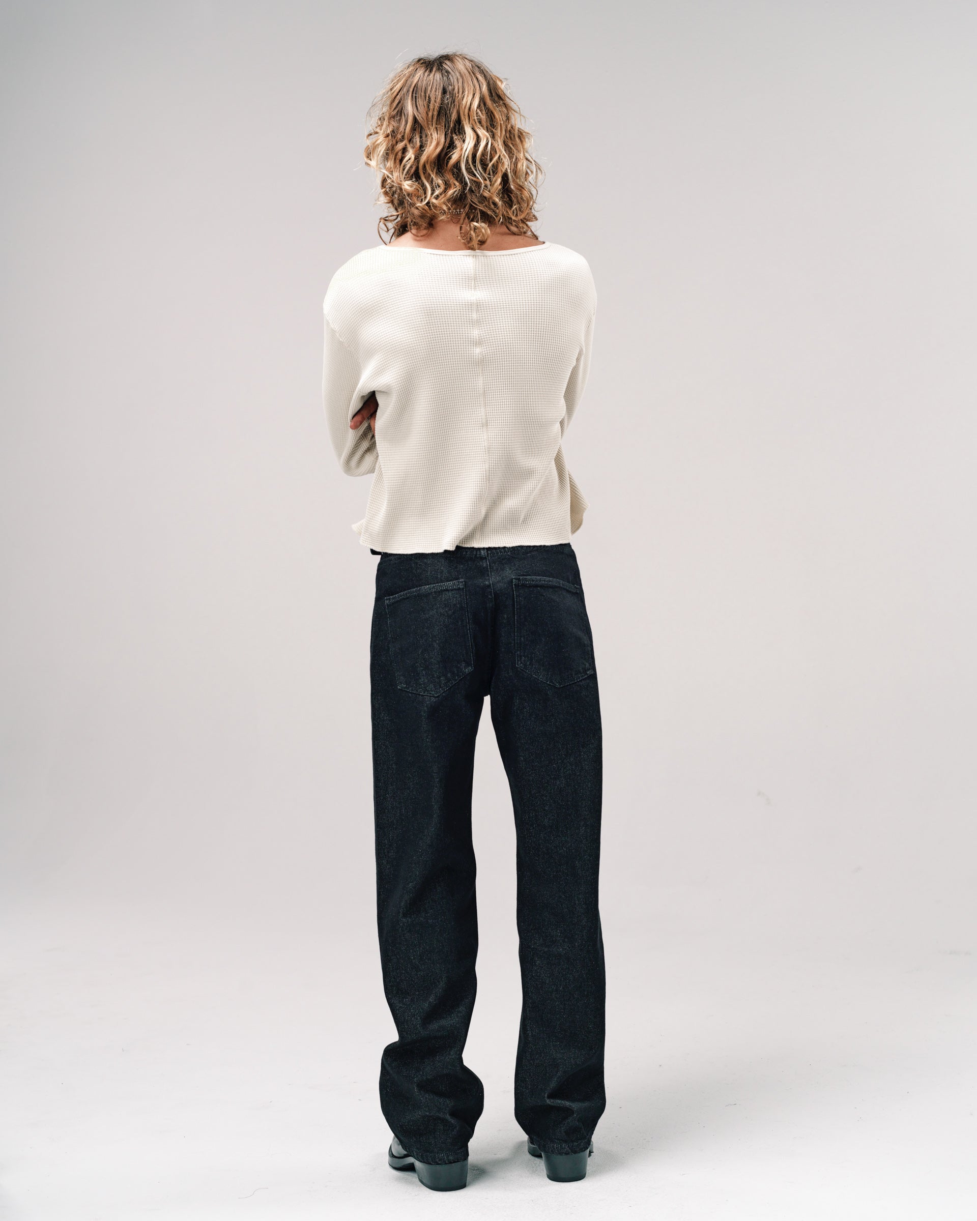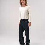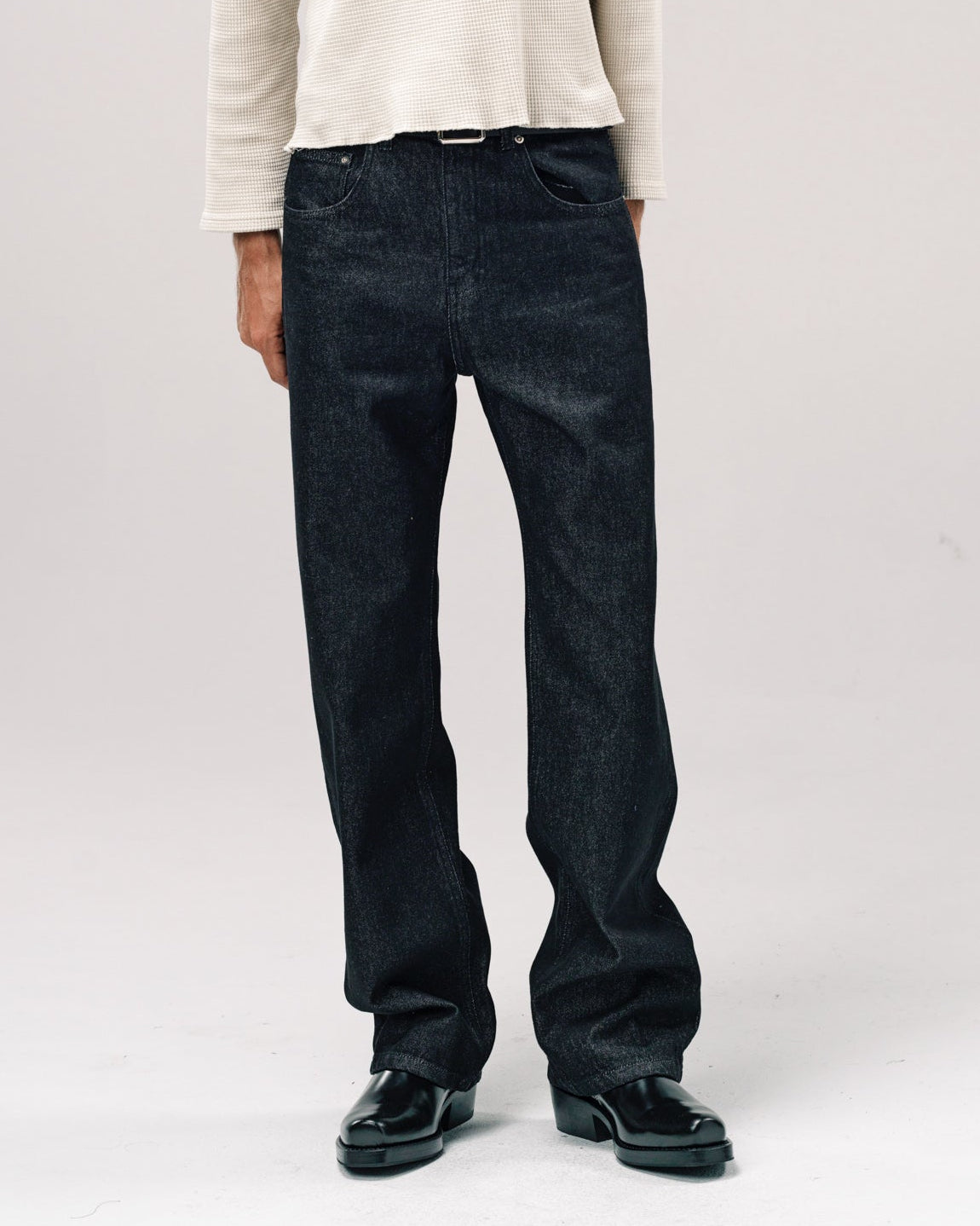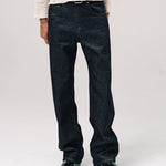 Relaxed classic fit Italian denim pant. SECOND/LAYER branded waistband button shank closure, leather back patch, and zip fly, Raw selvage indigo denim Longer classic rise with a relaxed fit.