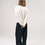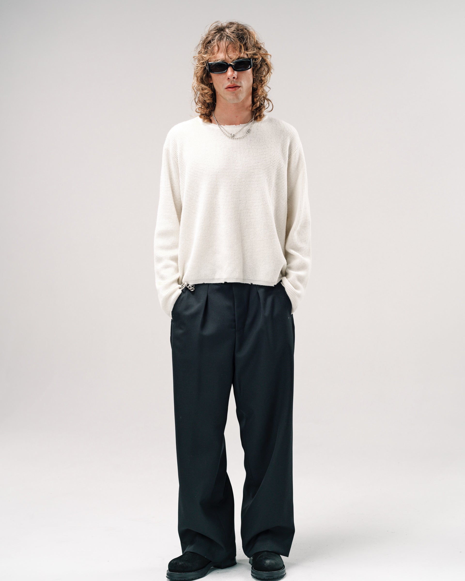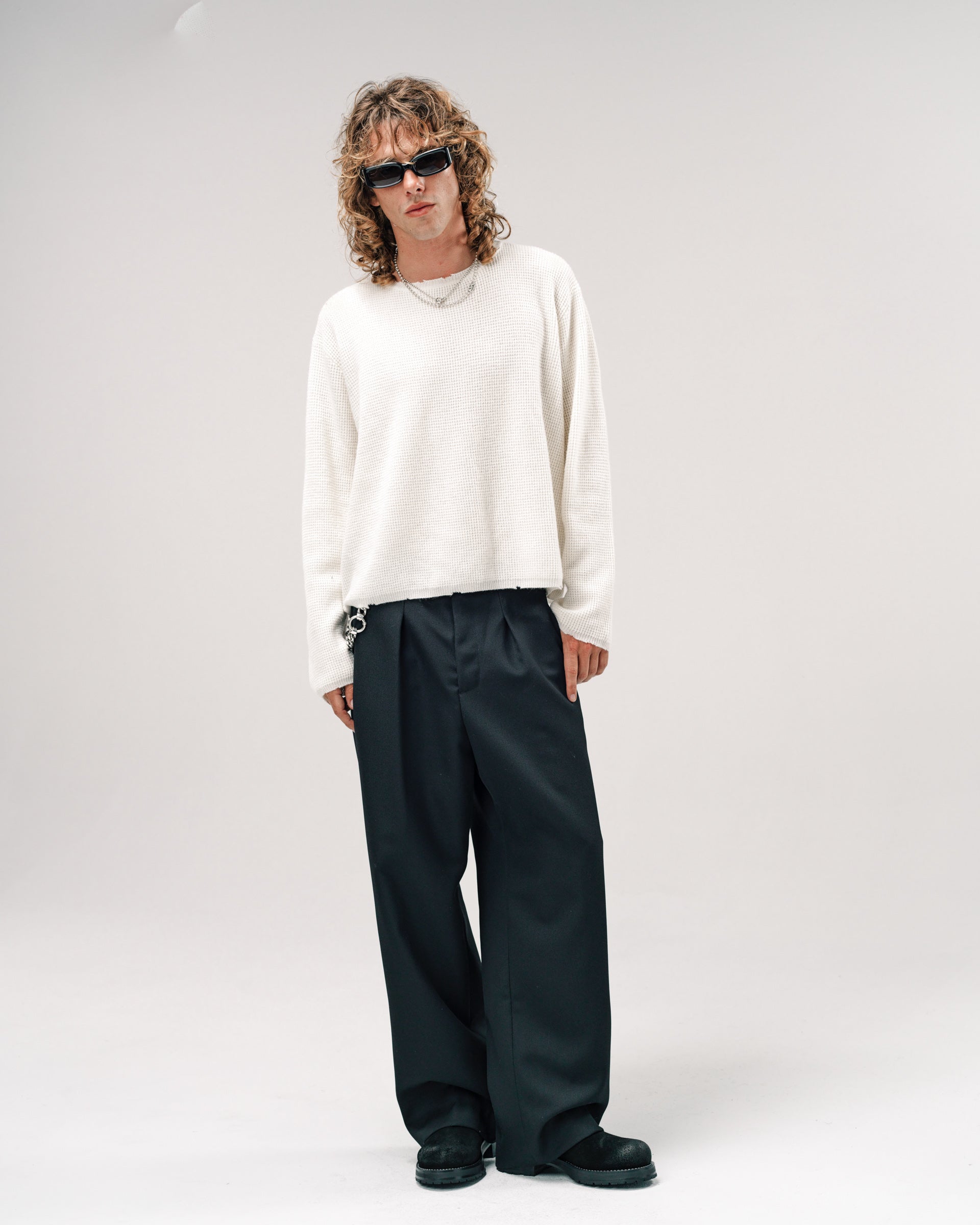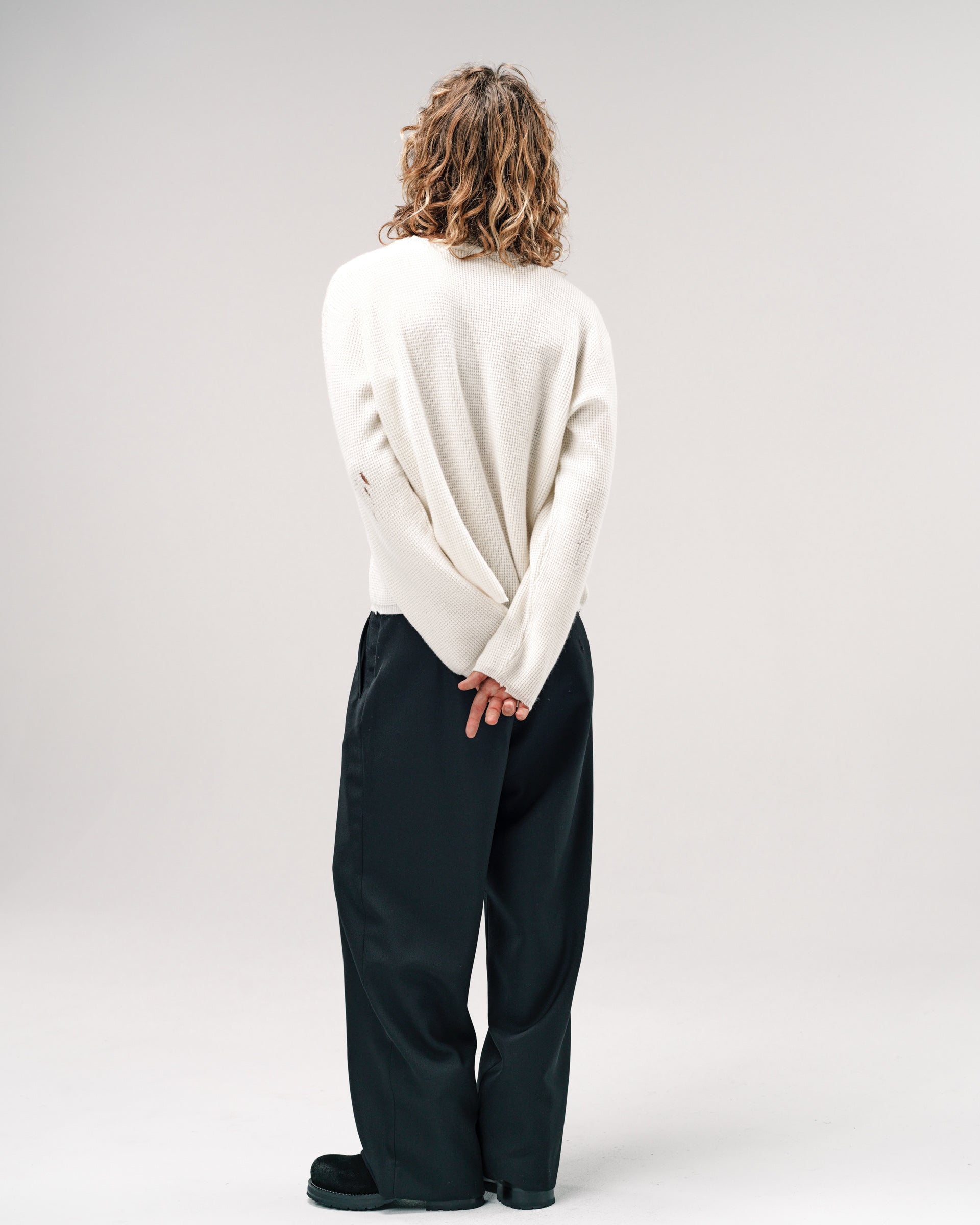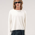 Relaxed cropped waffle knit pullover sweater in wool/cashmere blend yarn. Destroyed by hand to give a vintage look. Made in Italy.