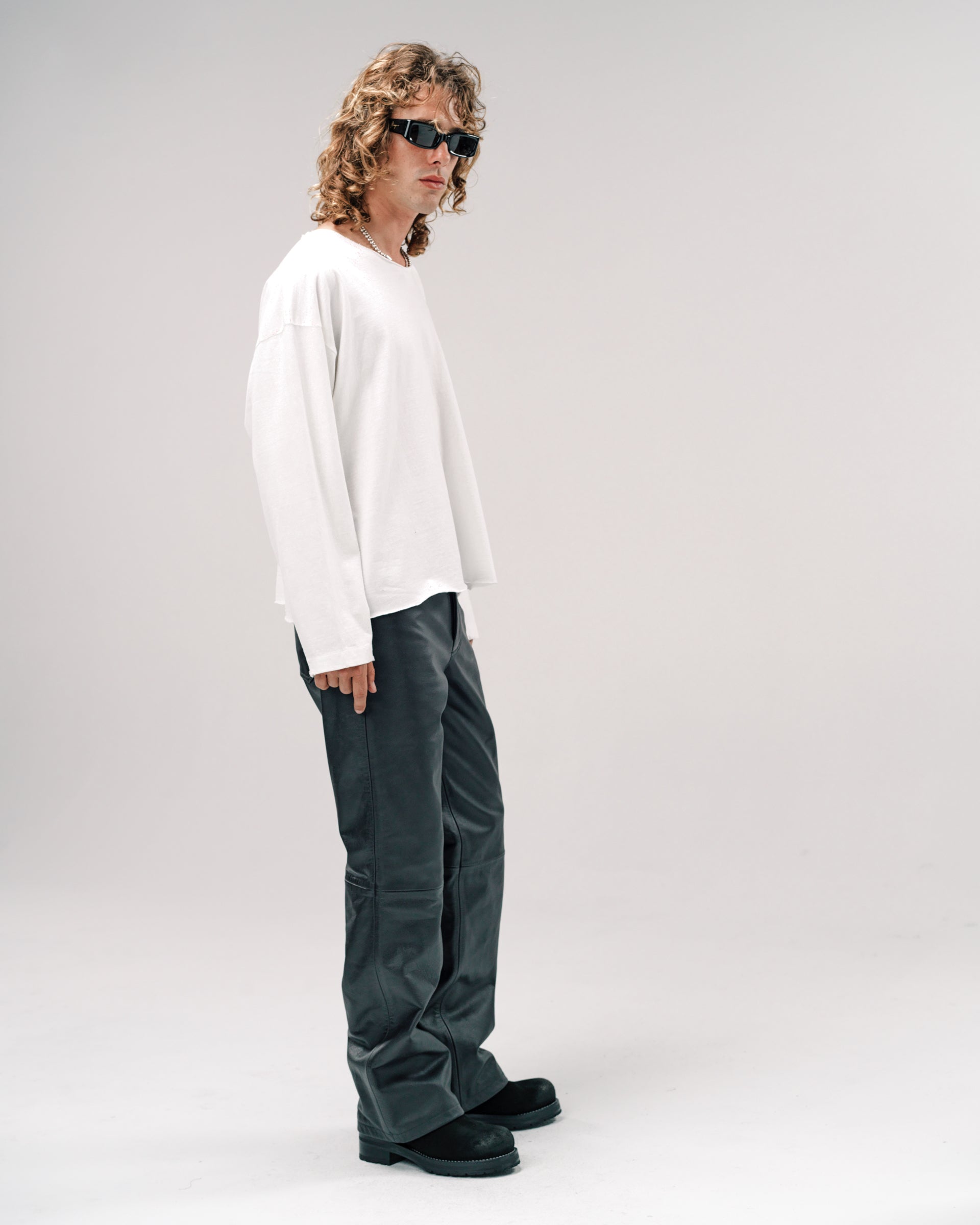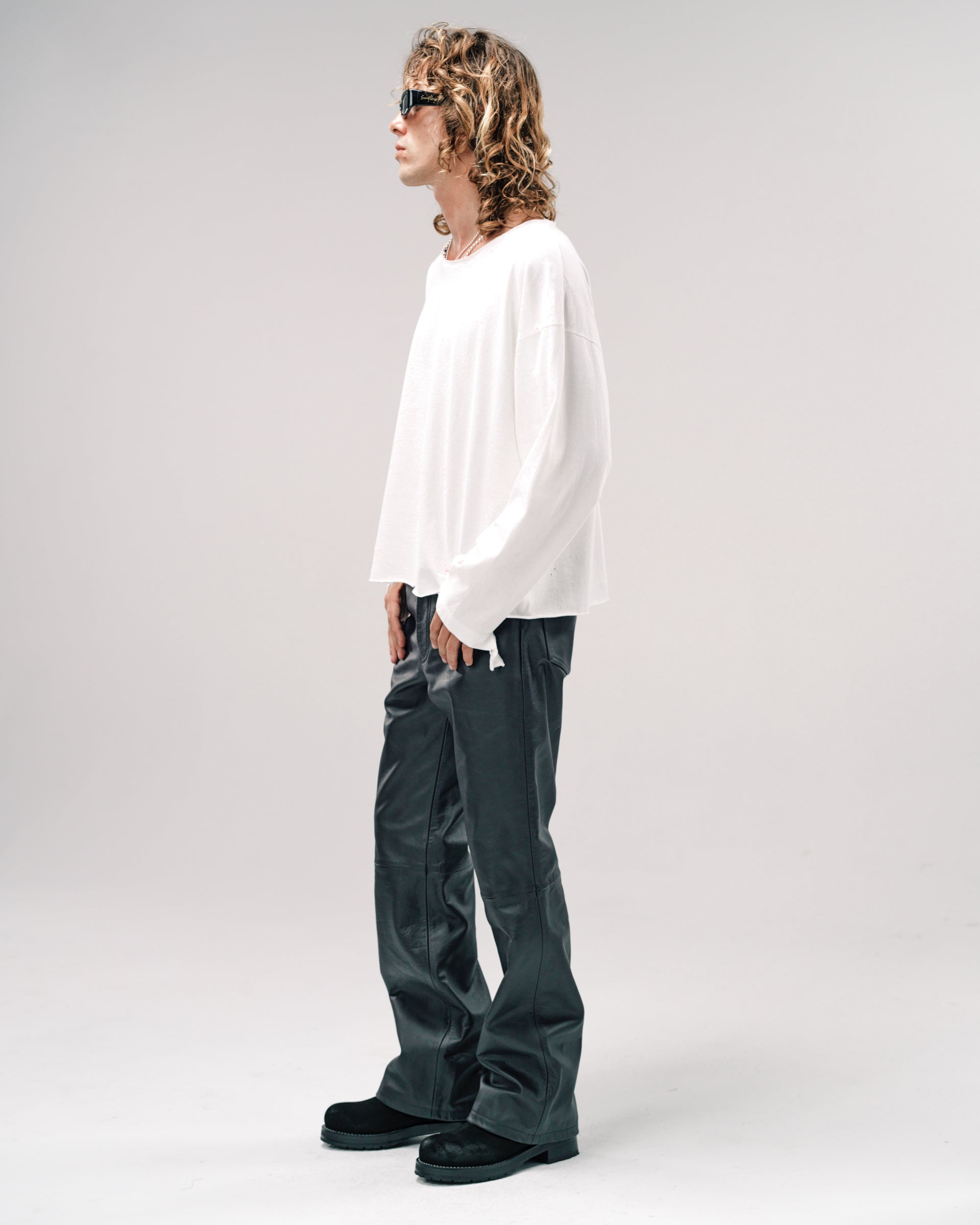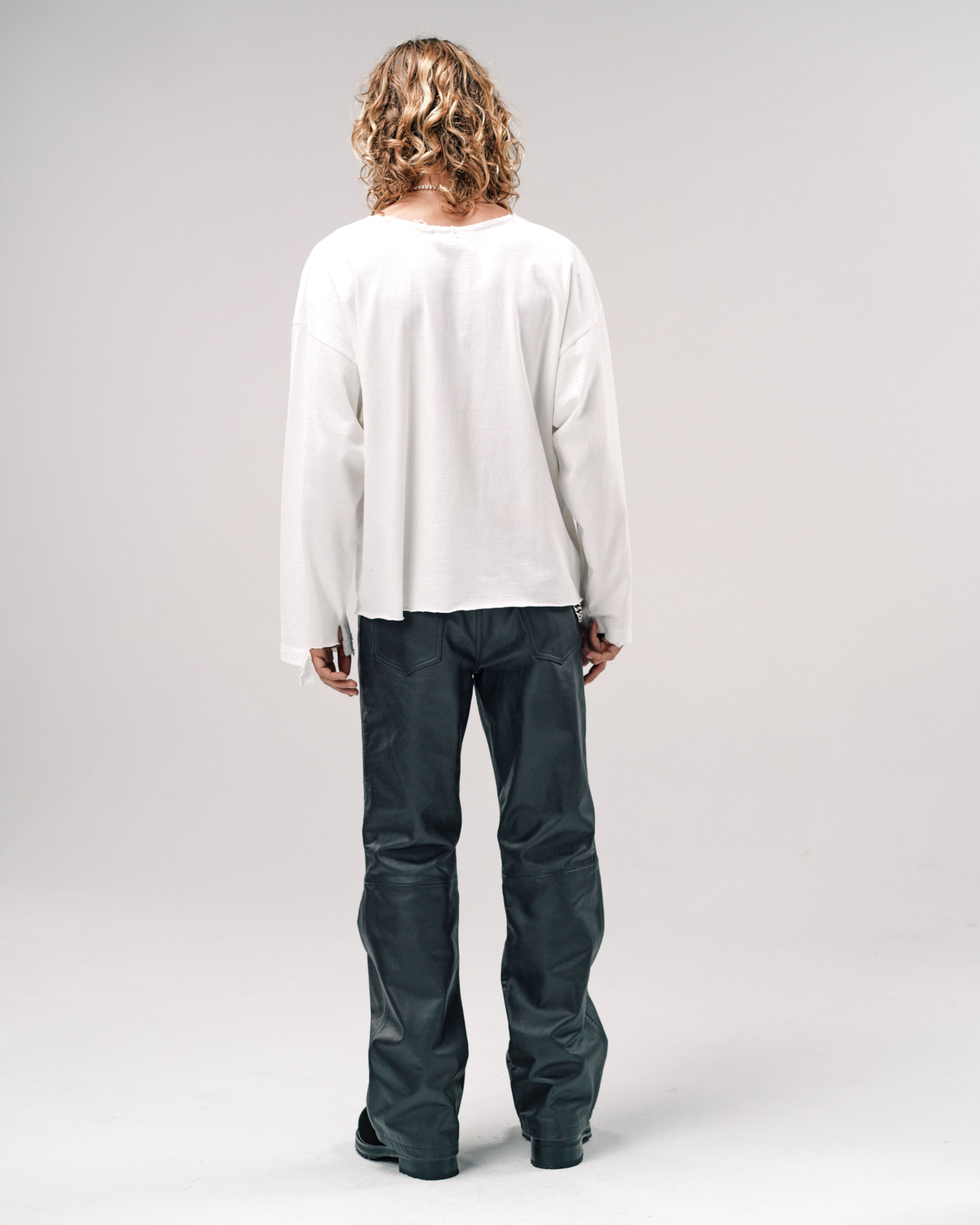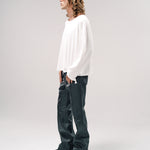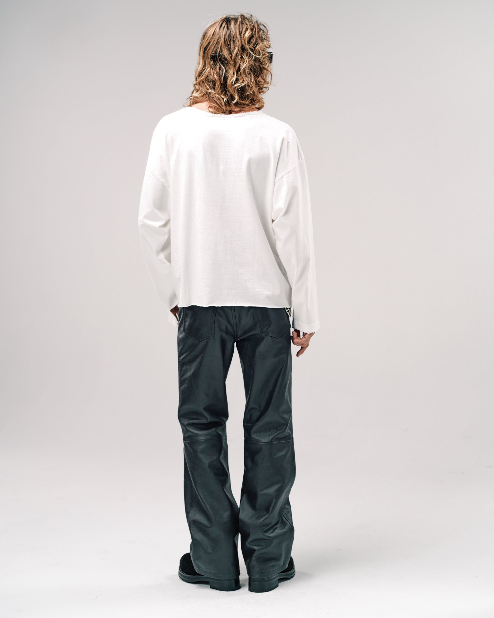 Long sleeve destroyed heavy weight Japanese jersey T-Shirt. Cropped relaxed fit long sleeve. Hand distressed in Japan.