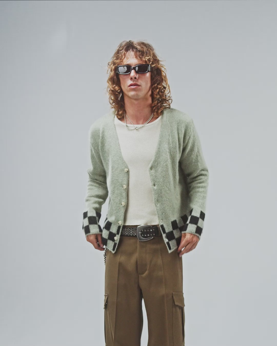 Relaxed fit Cardigan. 100% Mohair. Made in Italy A relaxed fit, V-neck button down cardigan. Brushed 100% Mohair.