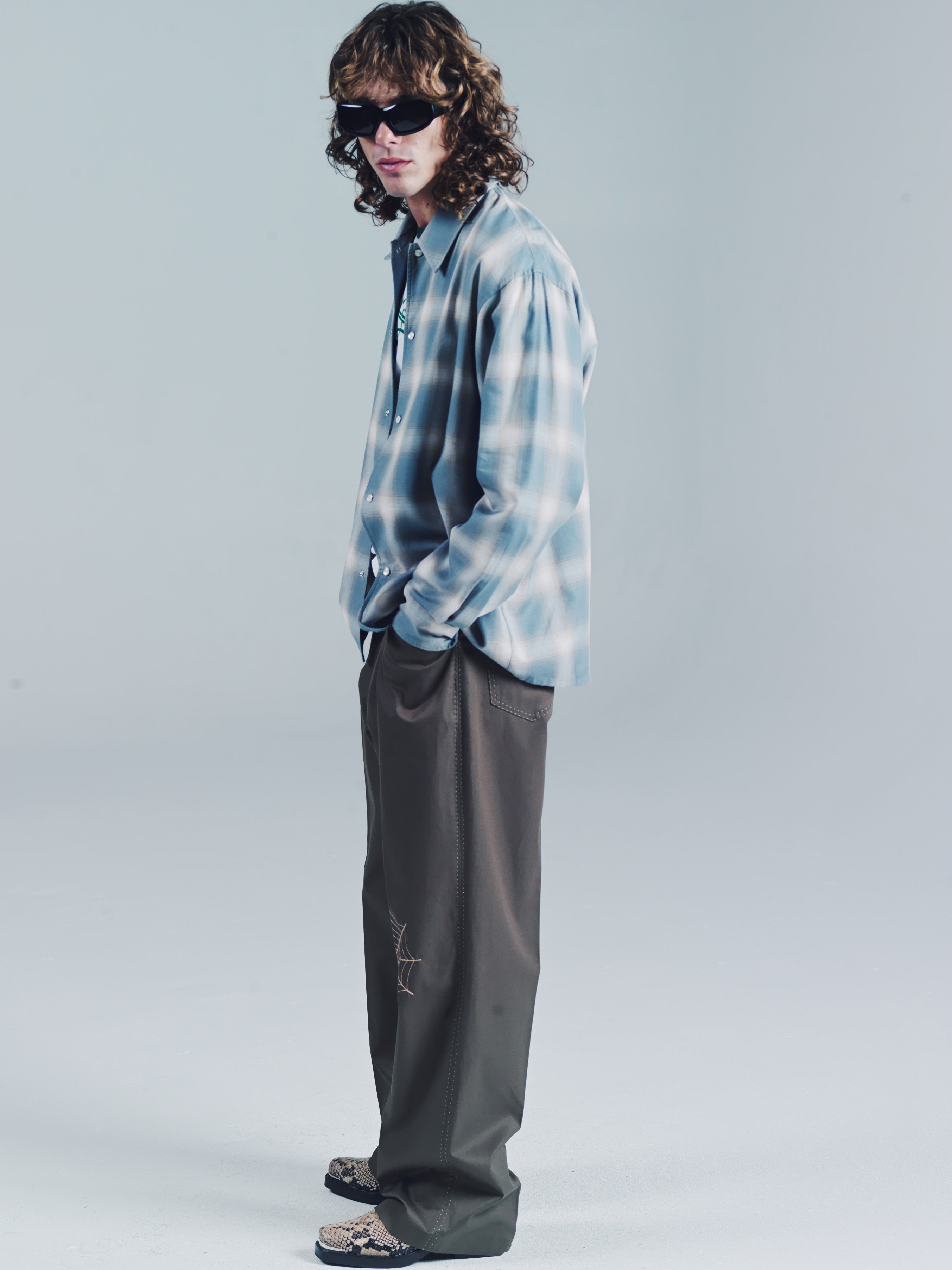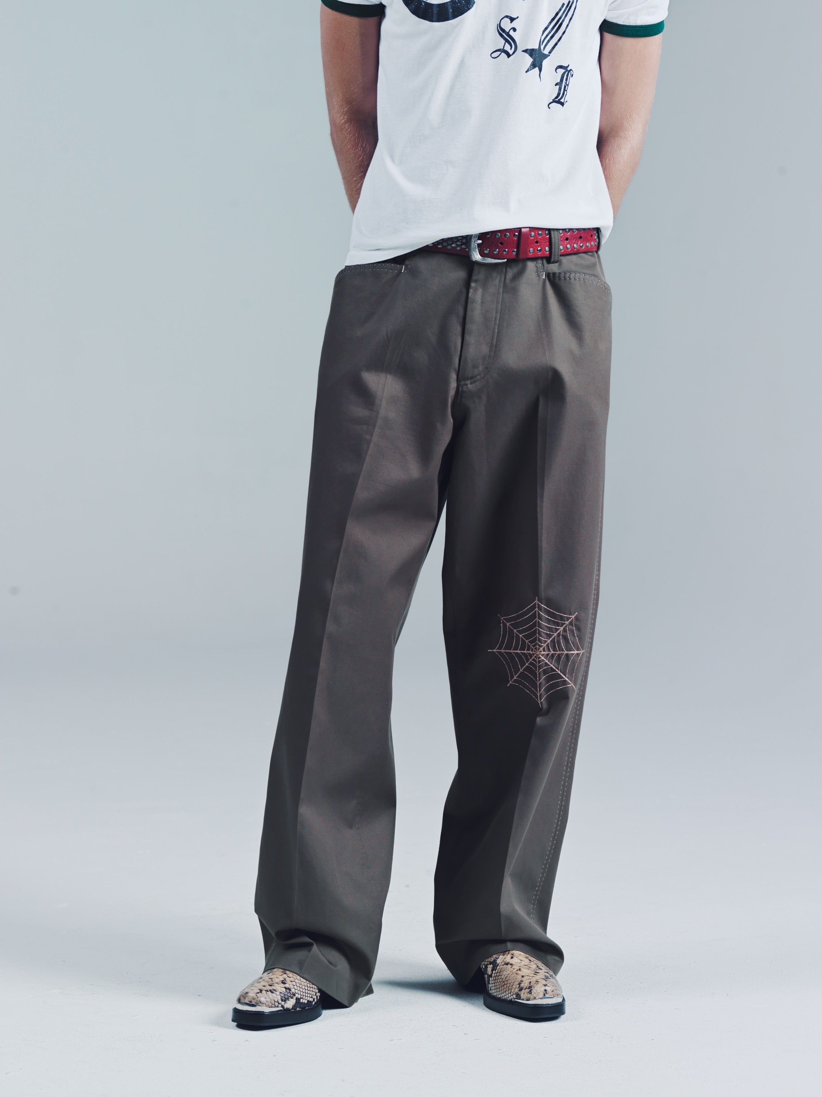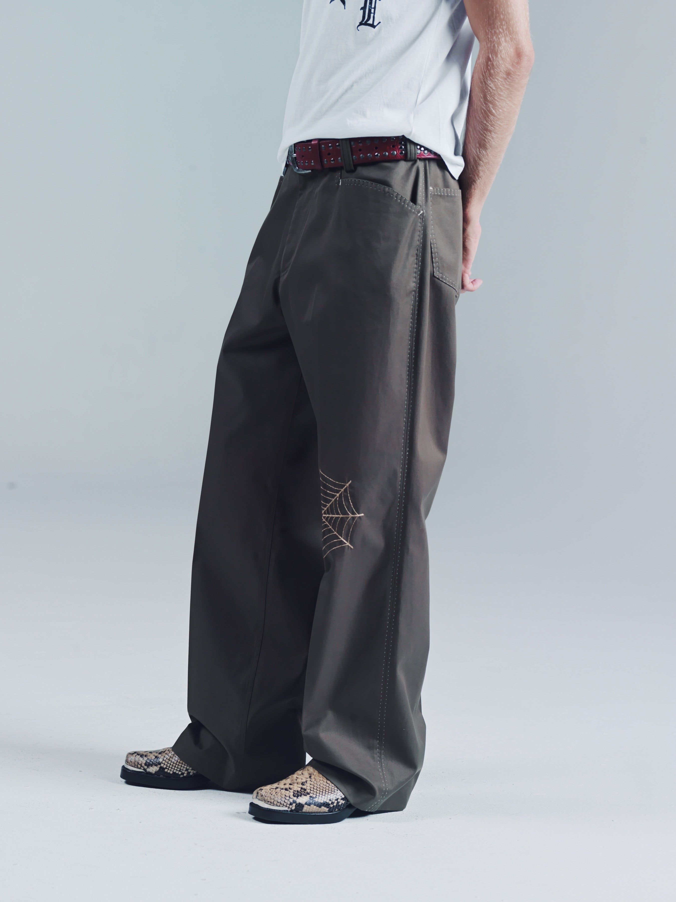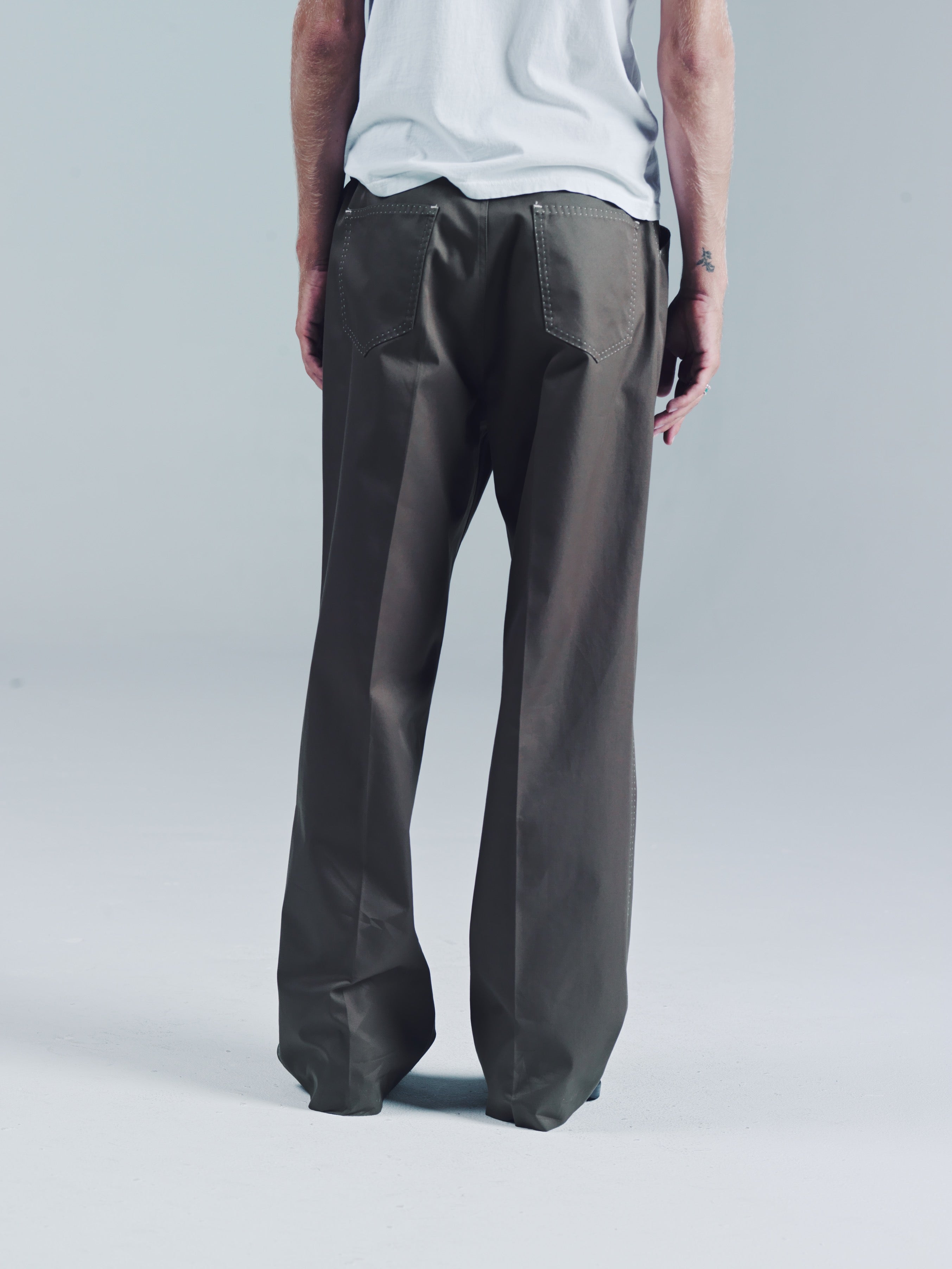 Fully constructed waistband with metal shank closure, zip fly, front slanted pockets, Two back patch pockets. IMF contrasted stitching detail along pockets and side seam. Black widow spider web chain stitching on knee. 100% recycled poly. Flat front relaxed bootcut fit. This trouser has more room than our Valluco in the leg and a hem opening that sits perfectly over a boot or sneaker. We like it a bit more slouchy looking worn at the hips. Make these your more casual version of the Vallucos. Model is 5'11 and wears a sz. 48. Dry clean and keep crispy. If your really down then get them creased. If your really really down, then do the crease yourself while listening to Ralfi Pagan.