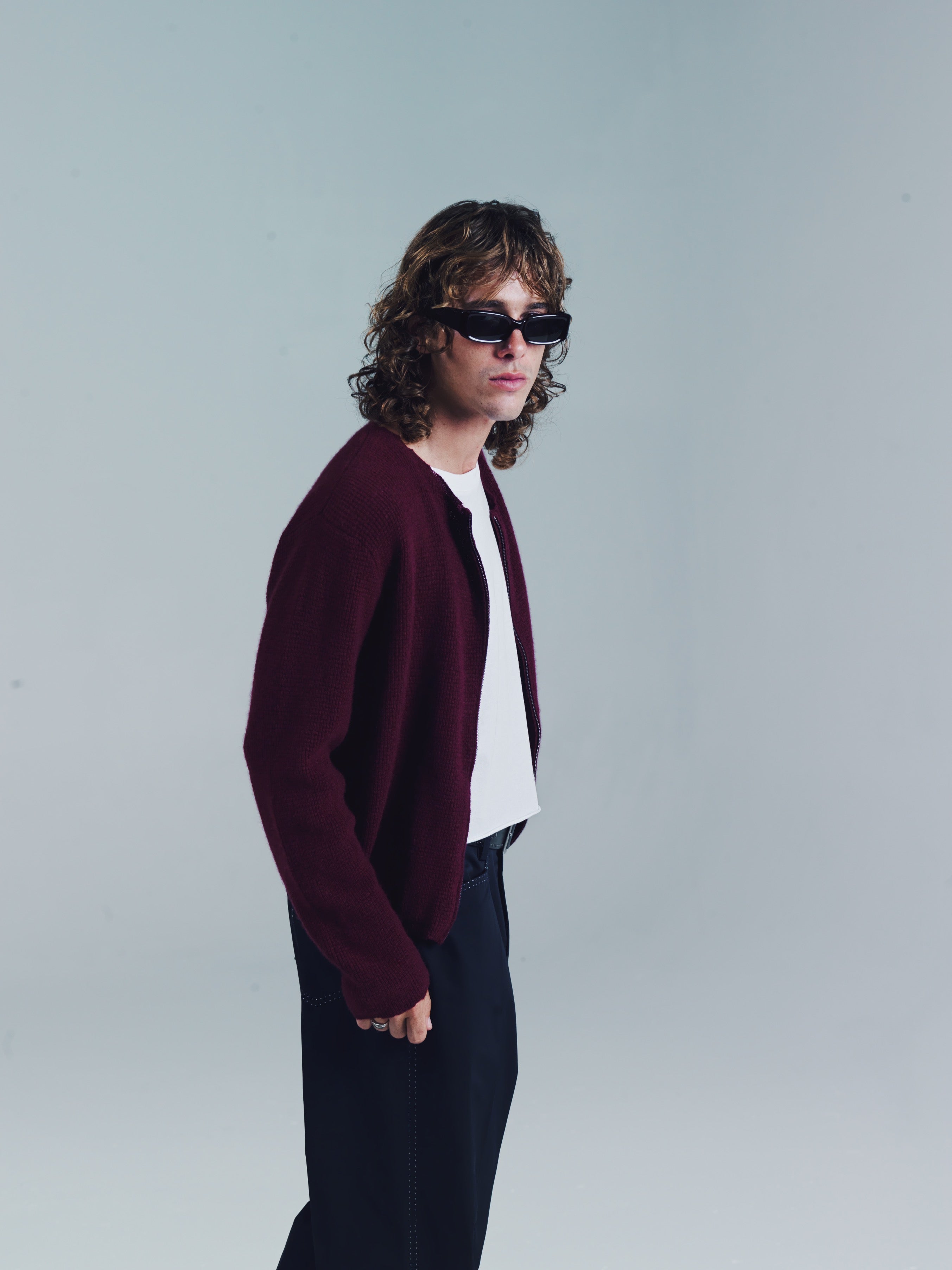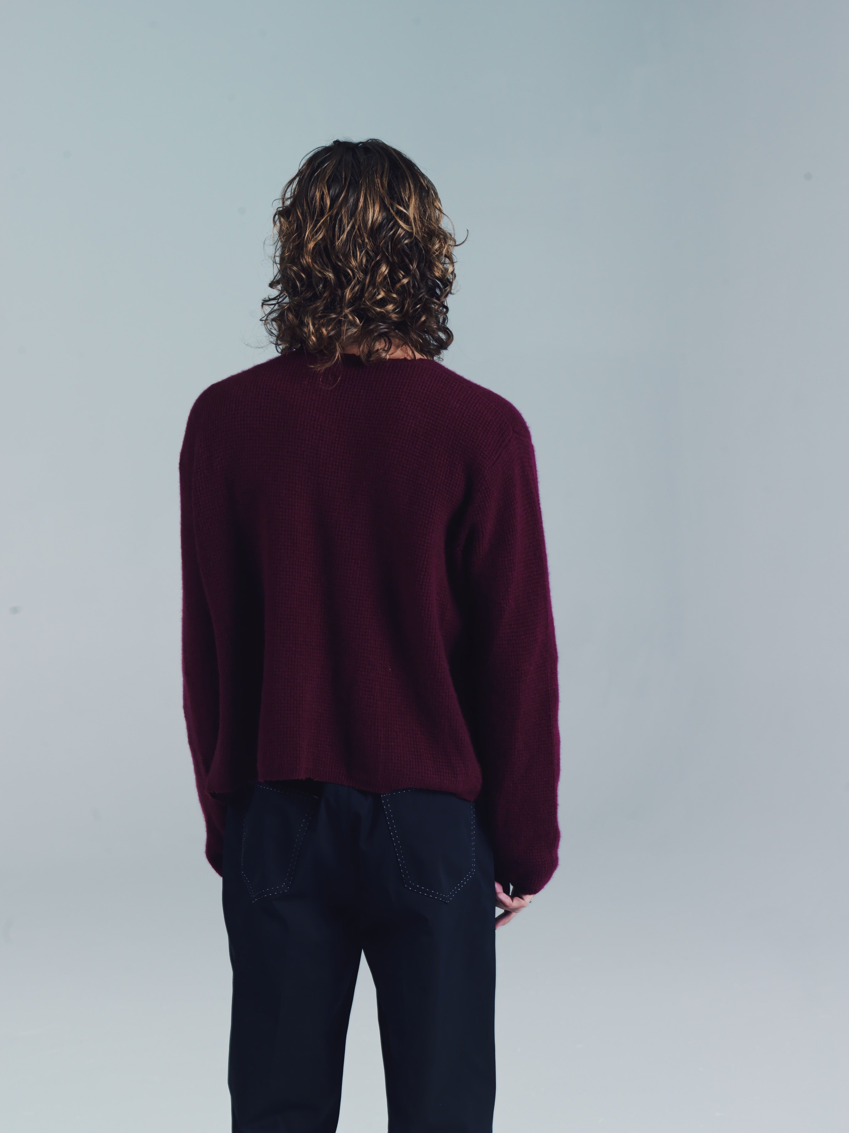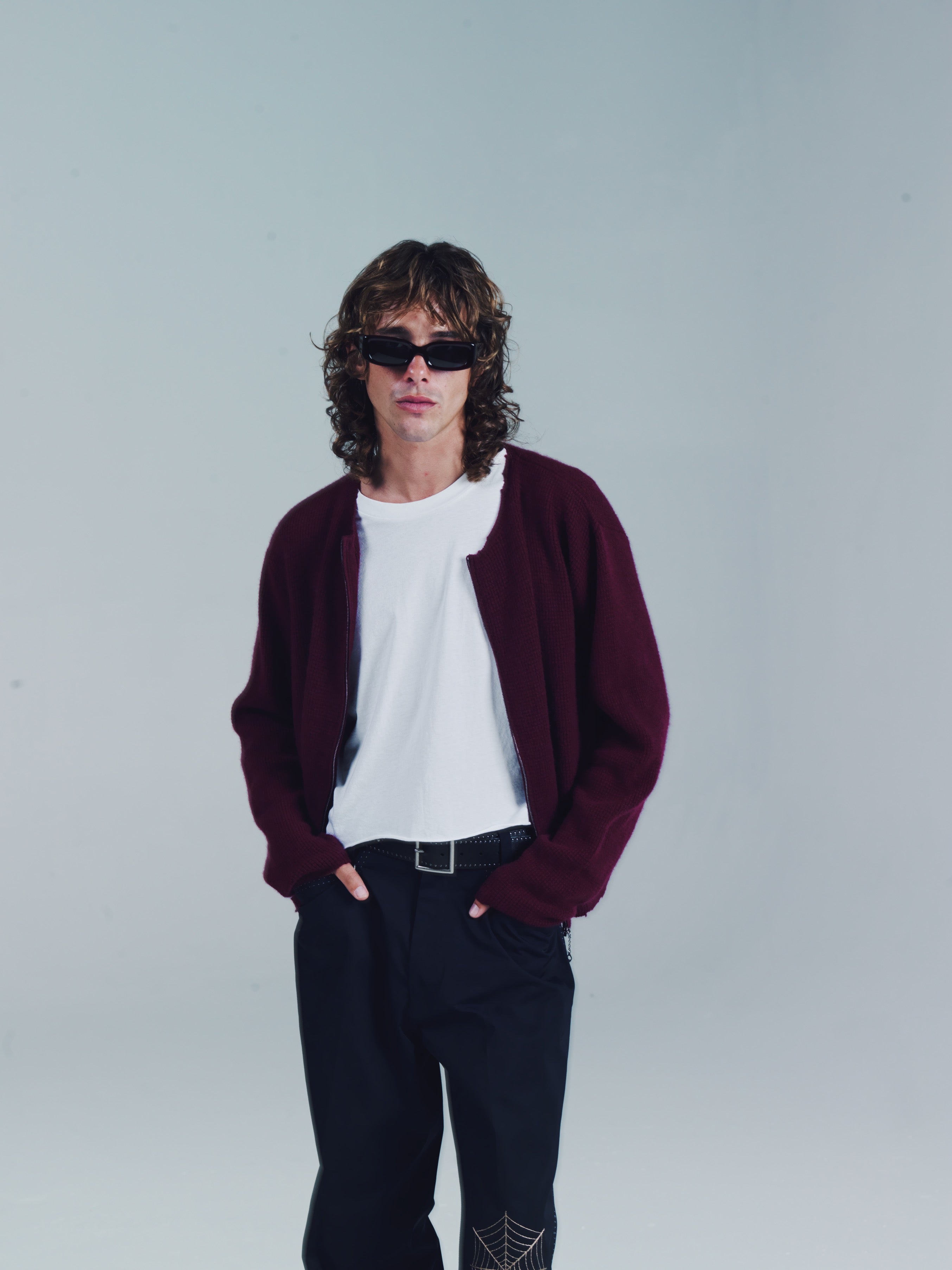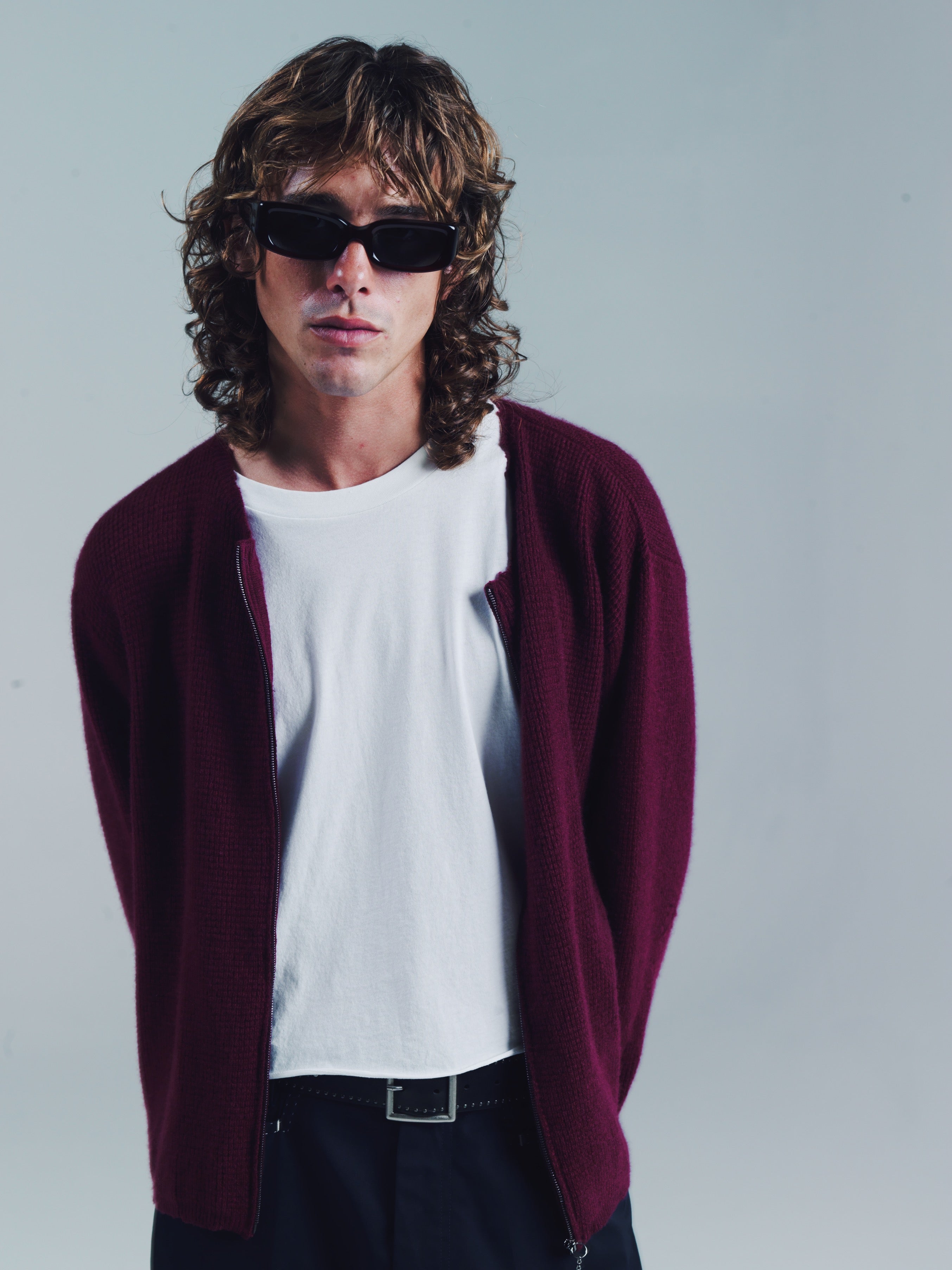 Zip up knit sweater with diamond chain zipper. Crew collar ribbed Collar and cuffs. Worn and destroyed look with worn neck hem, sleeve cuffs, and elbows. 100% Cashmere waffle knit. Worn slouchy look to be worn as a sweater over a vest either opened or closed. Works perfectly under a jacket as a layer. Just don’t let your girl take it. Consider it gone if that happens. Model is 6ft. and wears a Sz. M. Dry clean only. Don’t blow it. Act like you aren't brand new to this pimpin.