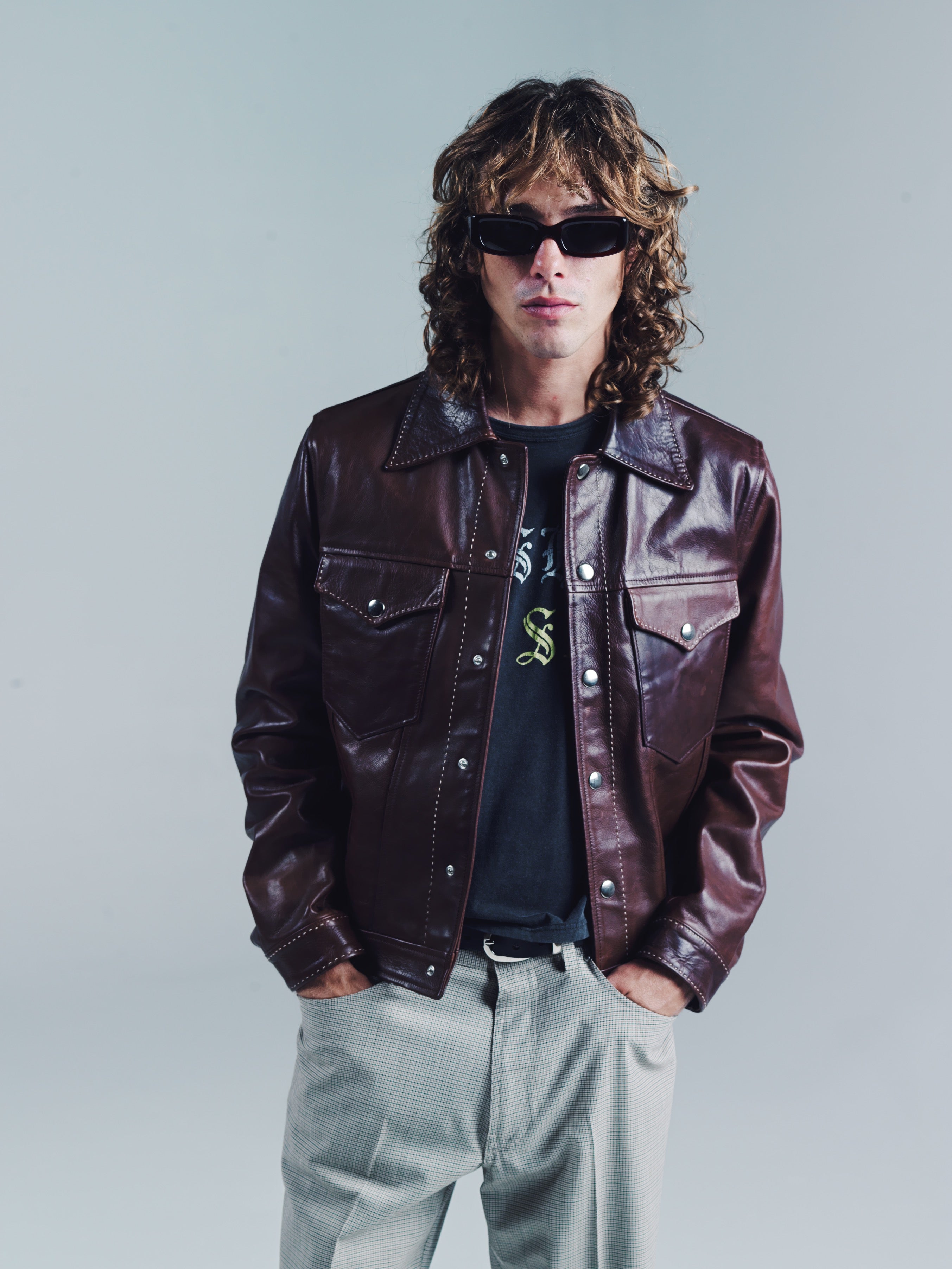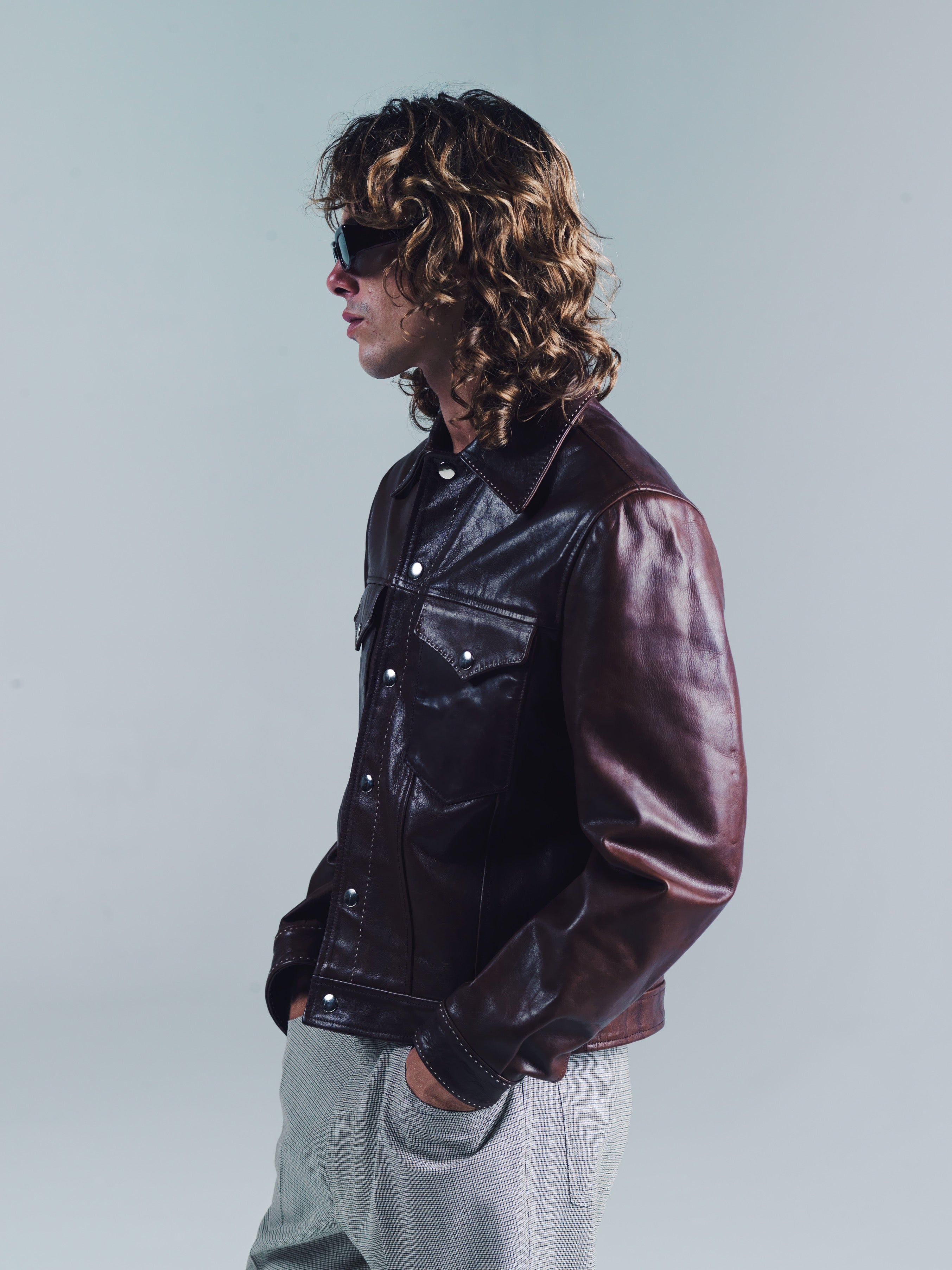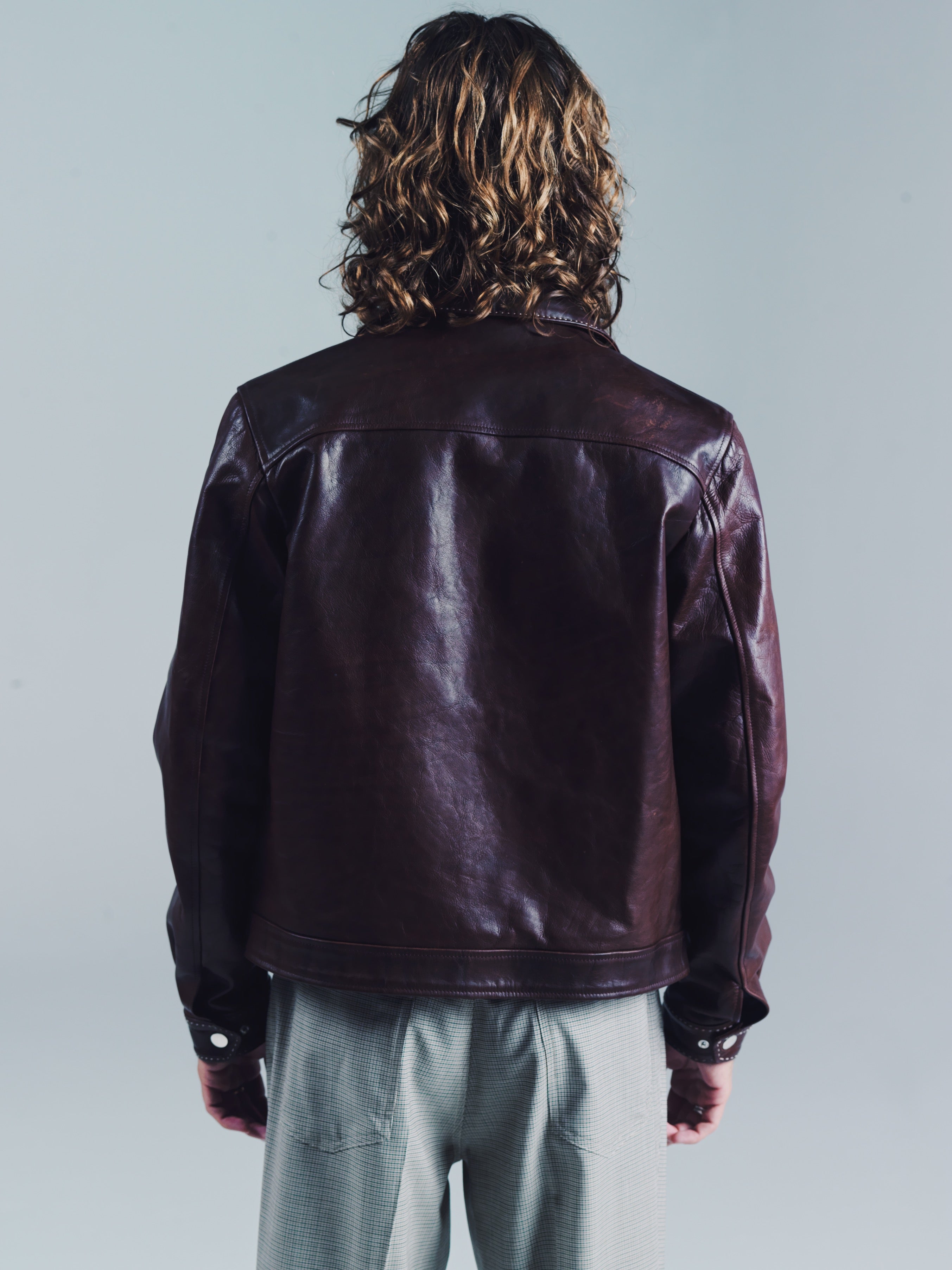 Worn metal cobrax snap button front closure. IMF contrasted stitching details. Front chest pockets with button snaps. Button snap cuffs. 100% Italian calf leather with oil finishing. Classic relaxed fit. Oiled calf leather. Clean cut, not your basic trucker. A classic piece that will never leave rotation. Model is 5'11 and wears a Sz. 48. Made in Italy of Oiled calf leather. Please note the color tone will differ in every item due to the amount of oil absorbed by the leather. If you need to clean it just wipe it down. Other than that you should embrace the wear and just make sure you air it out after wear.