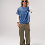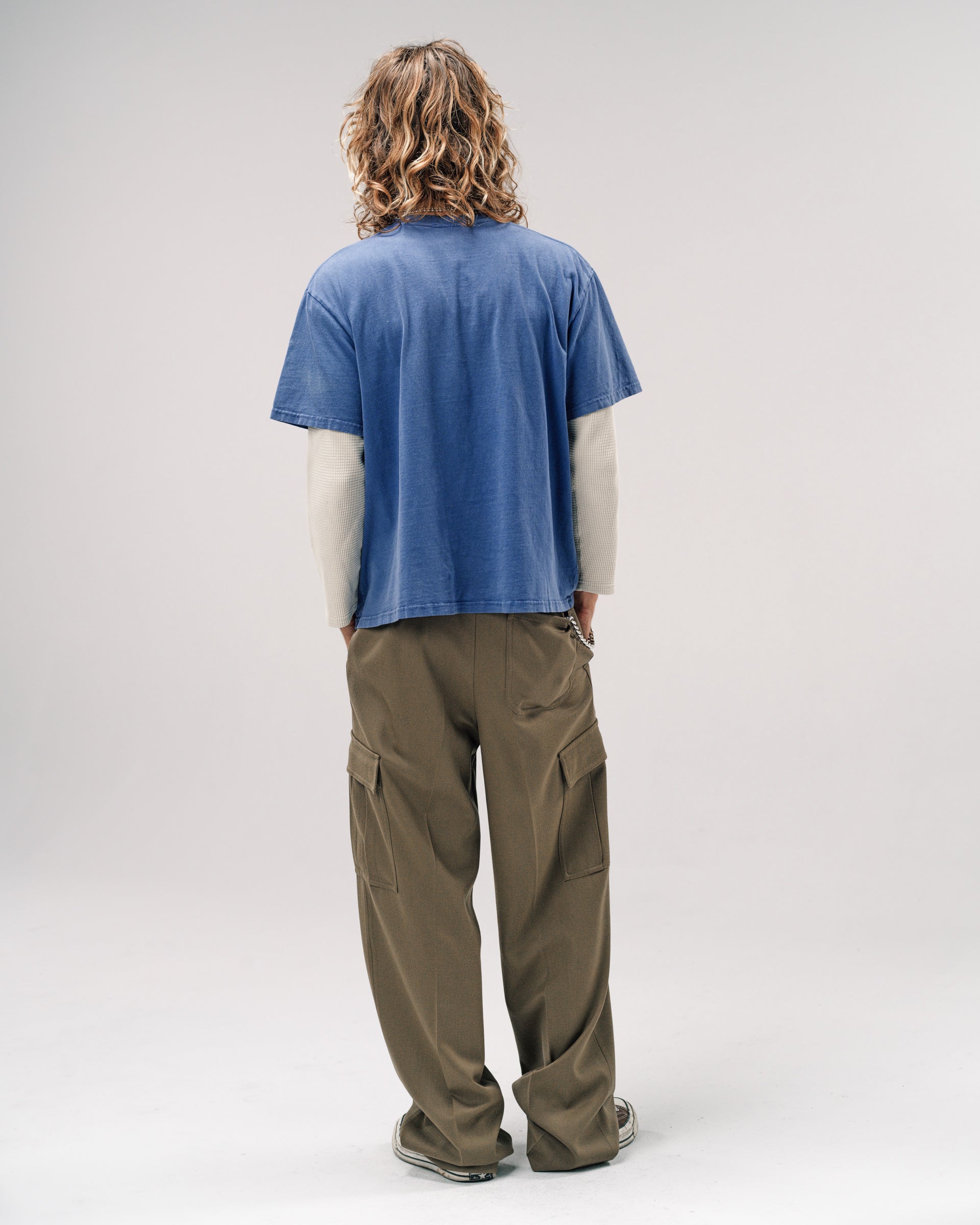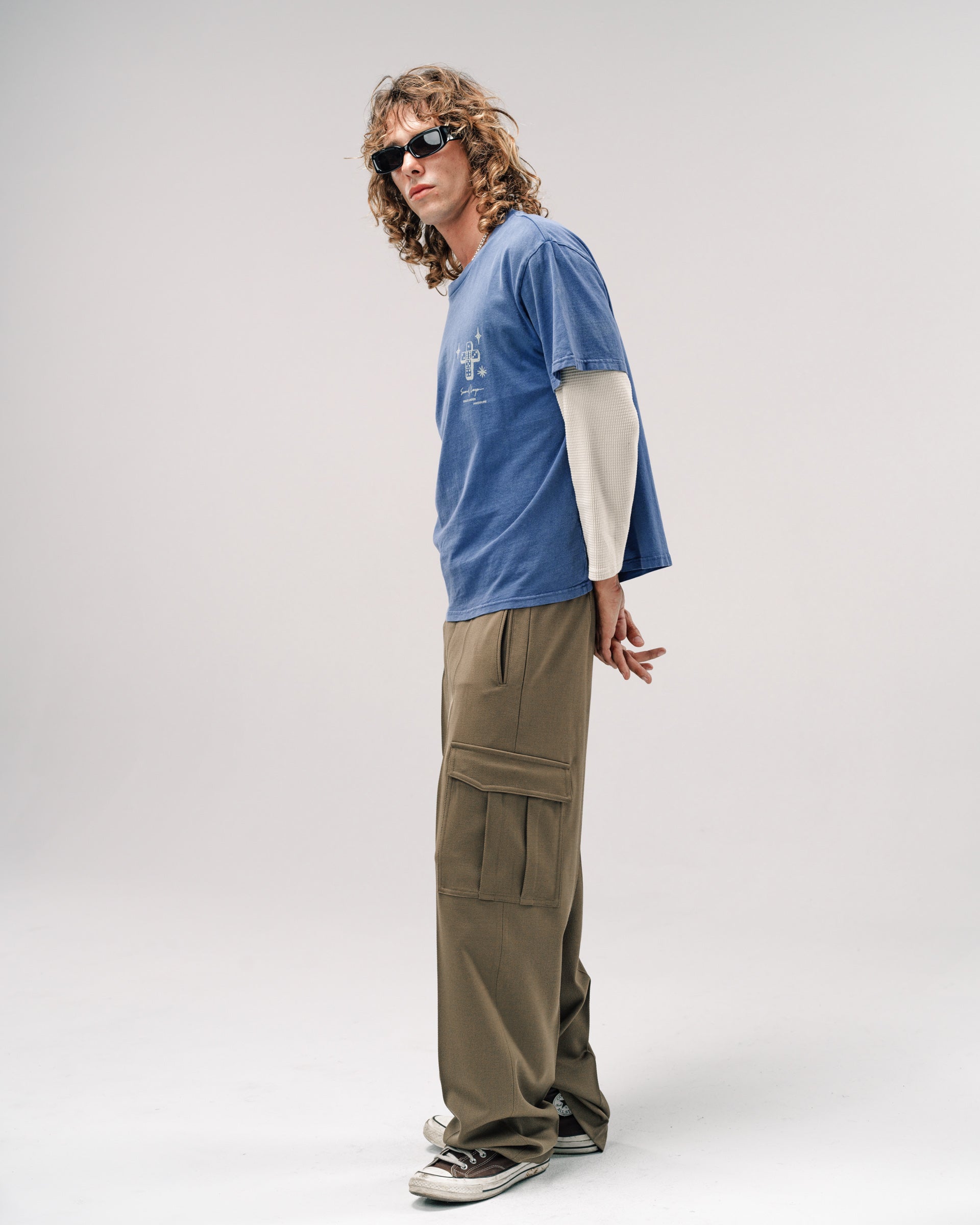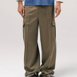 An elevated cargo trouser. Slouchy fit with a clean sleek vibe. Model is 5'11 ft. and wears a Sz. 46.