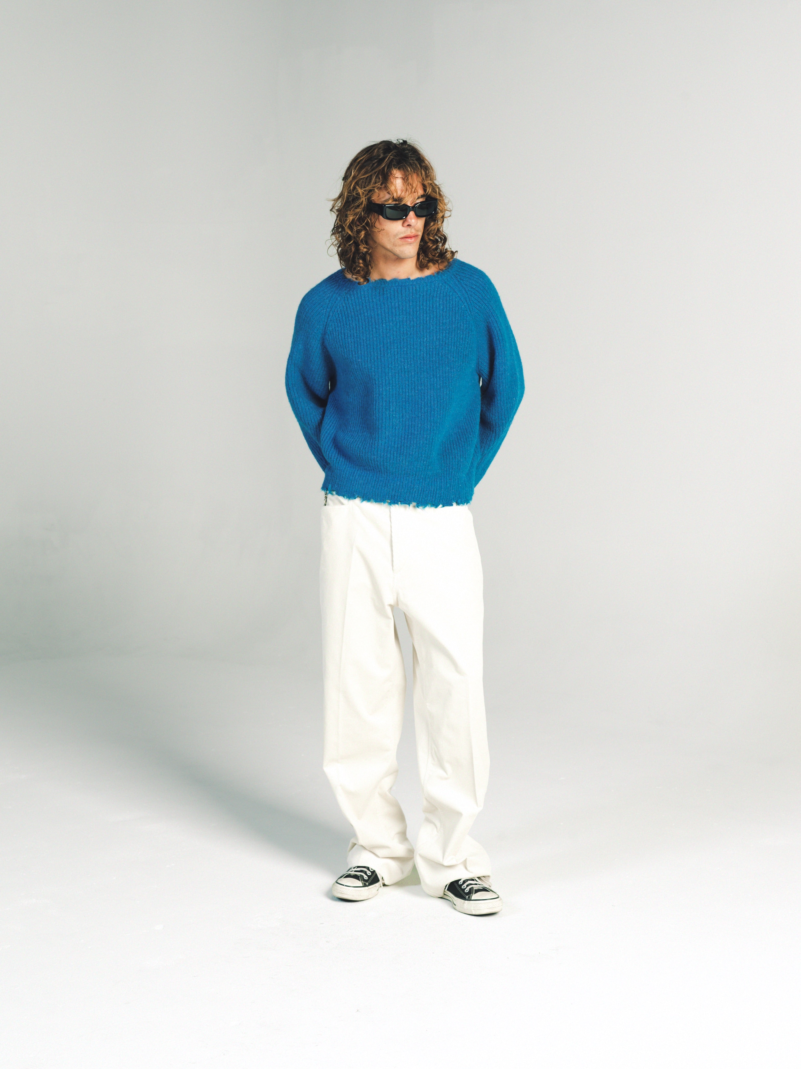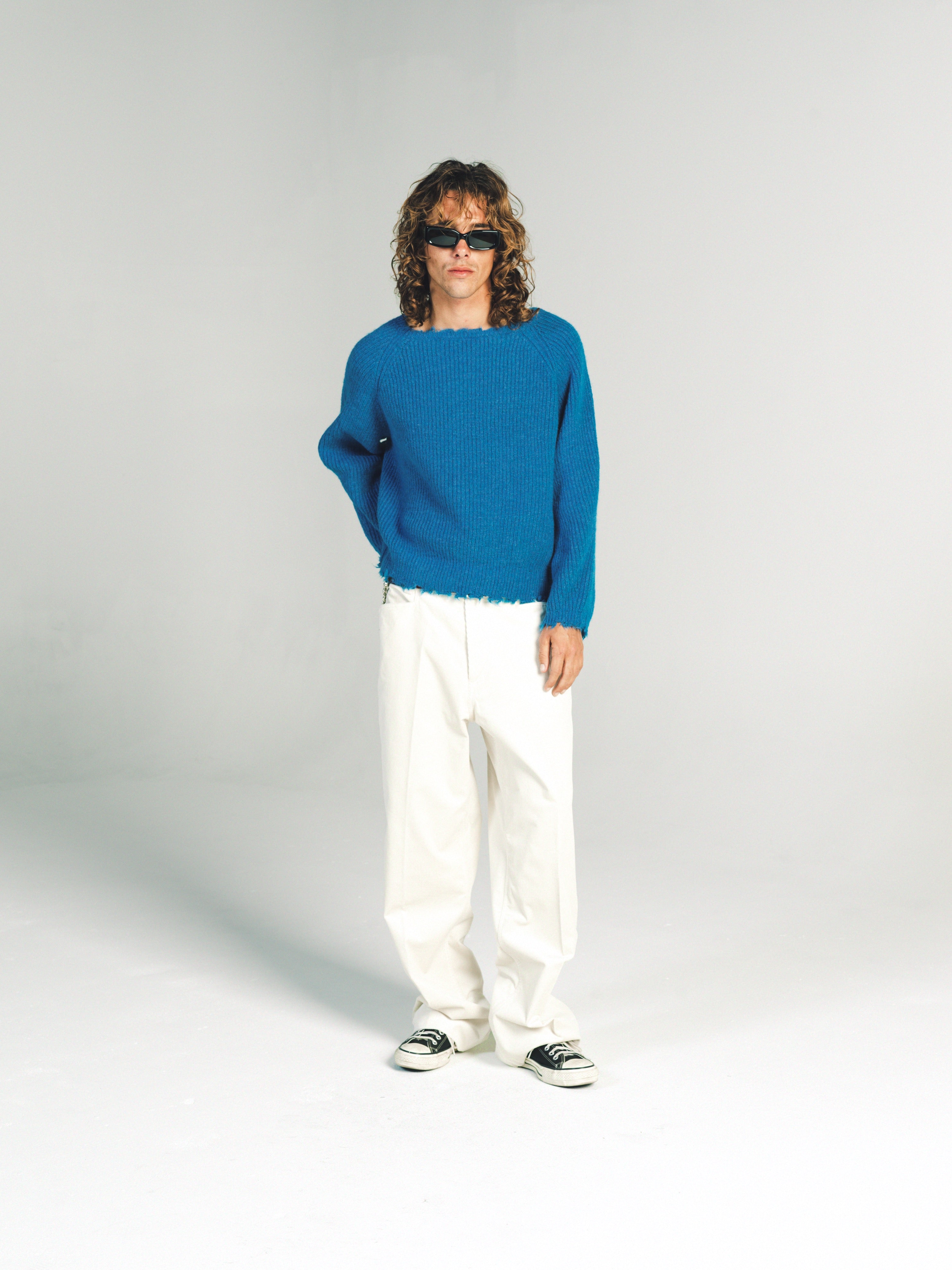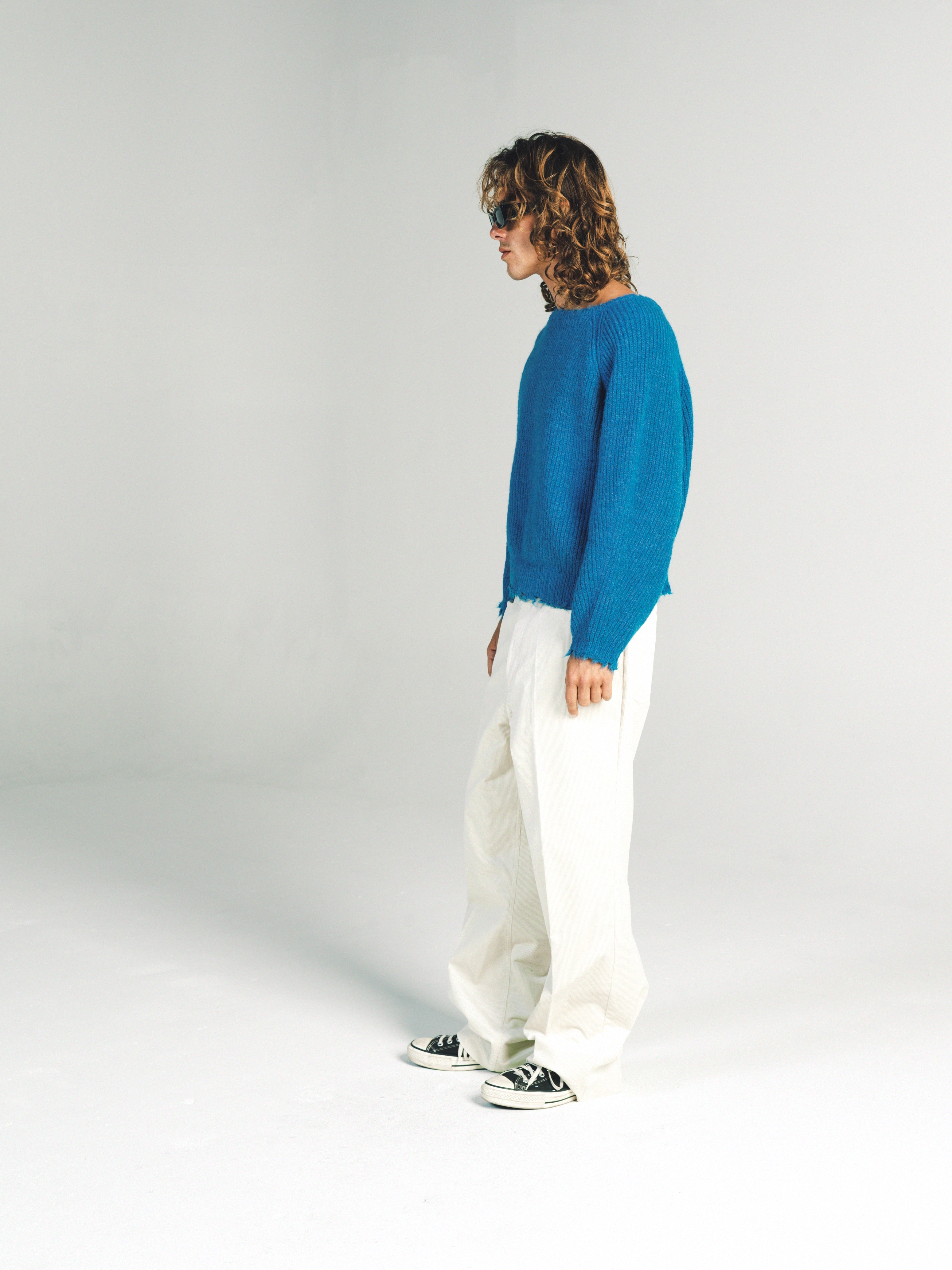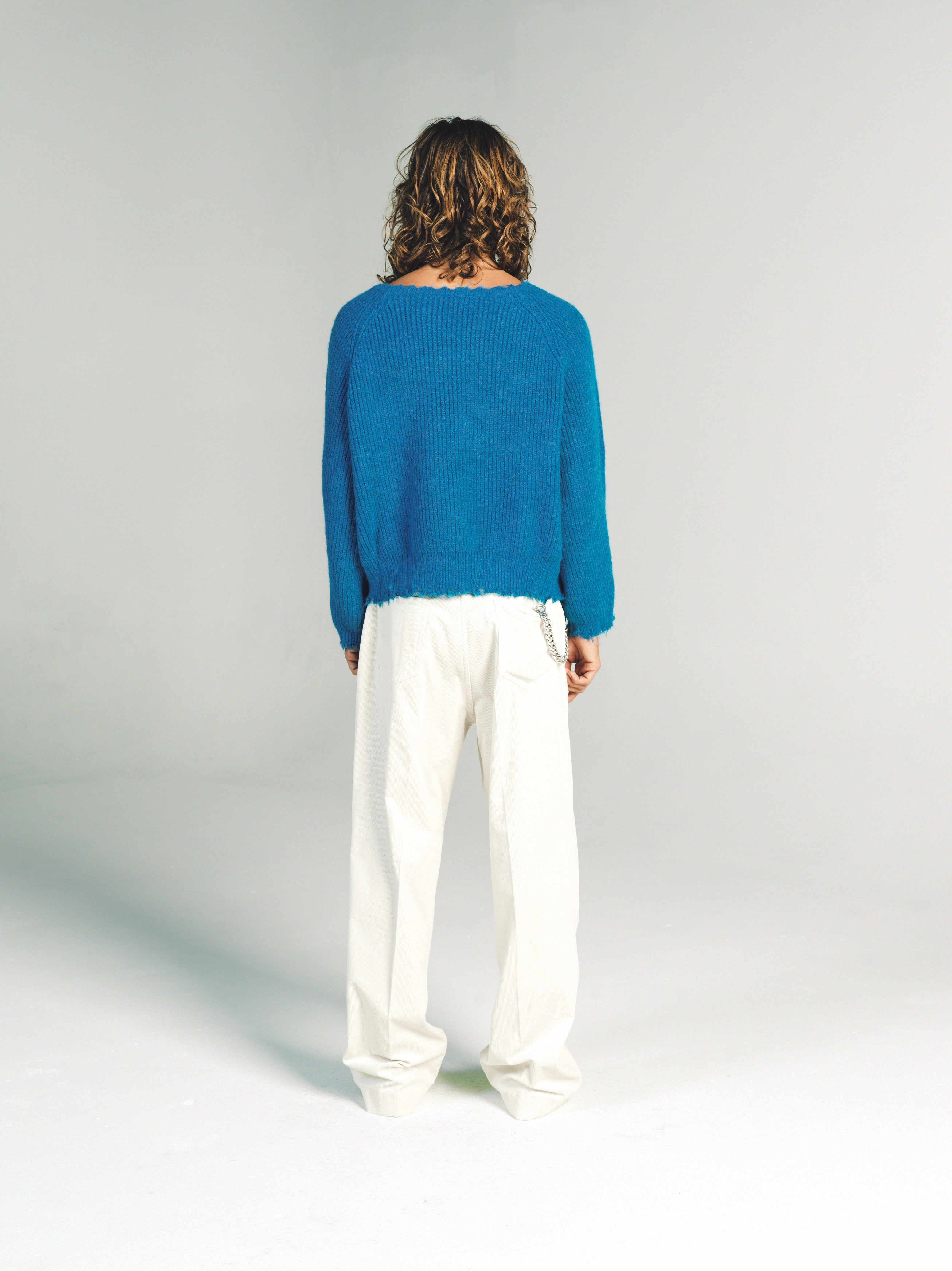 Pullover sweater, raglan sleeve, Destroyed ribbed neck, cuffs, and hem. Shrunken boxy fit. Heavy gauge knit to keep you warm. Model is 5'11 and wears a Medium. Dry Clean only! Take care of it by letting it air out on a hanger for 24hrs after wearing so it doesn’t collect all of your previous days odor. Nobody likes a stinky knit. After air drying don’t let it sit on a hanger for to long as you will get those weird hanger indents and it can stretch if hung for to long.