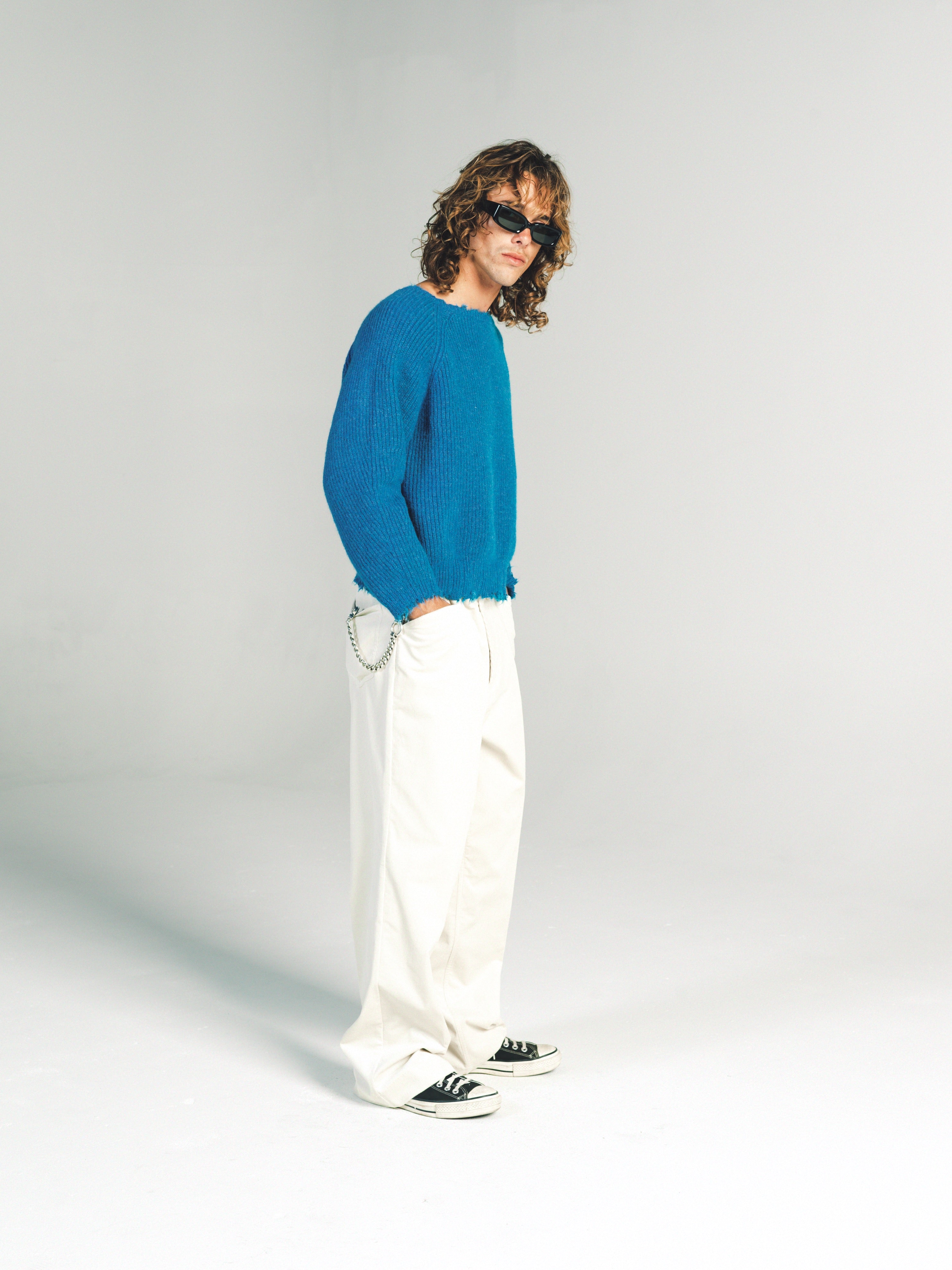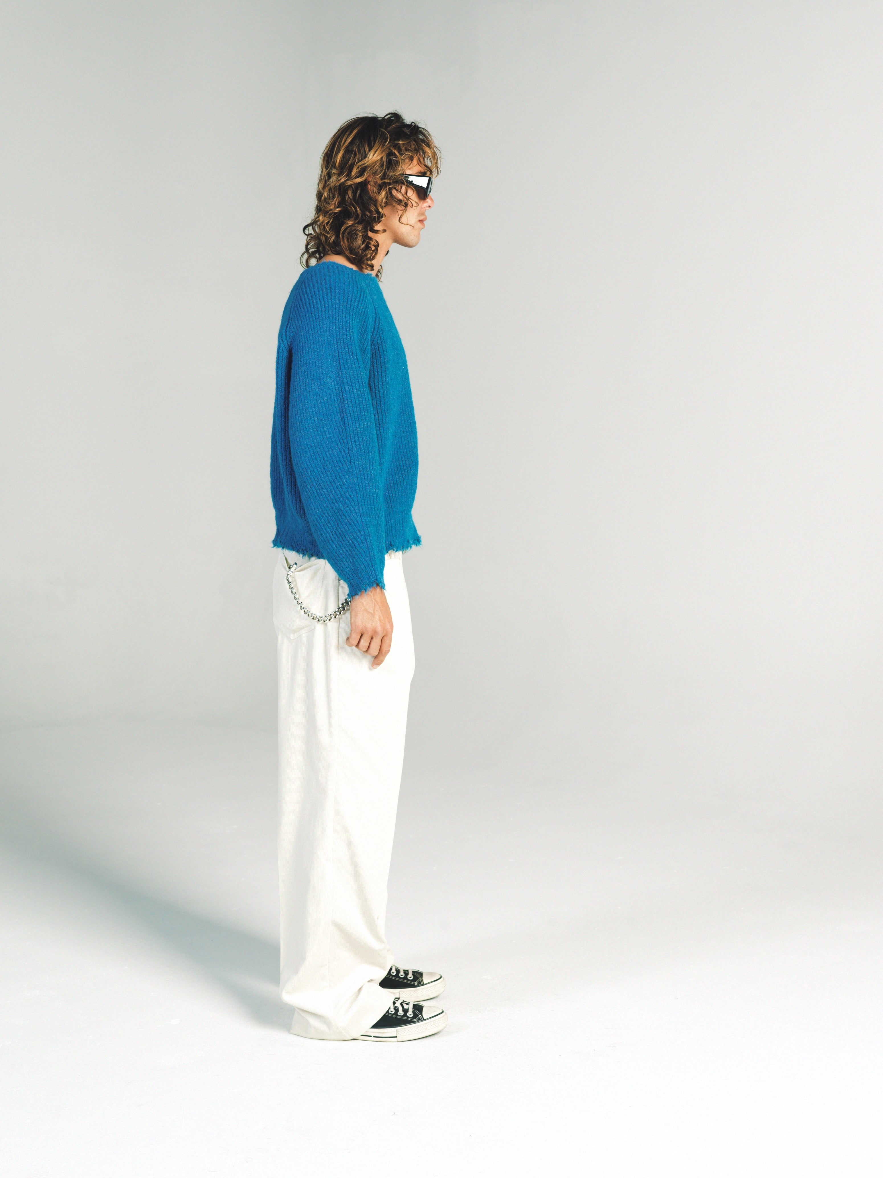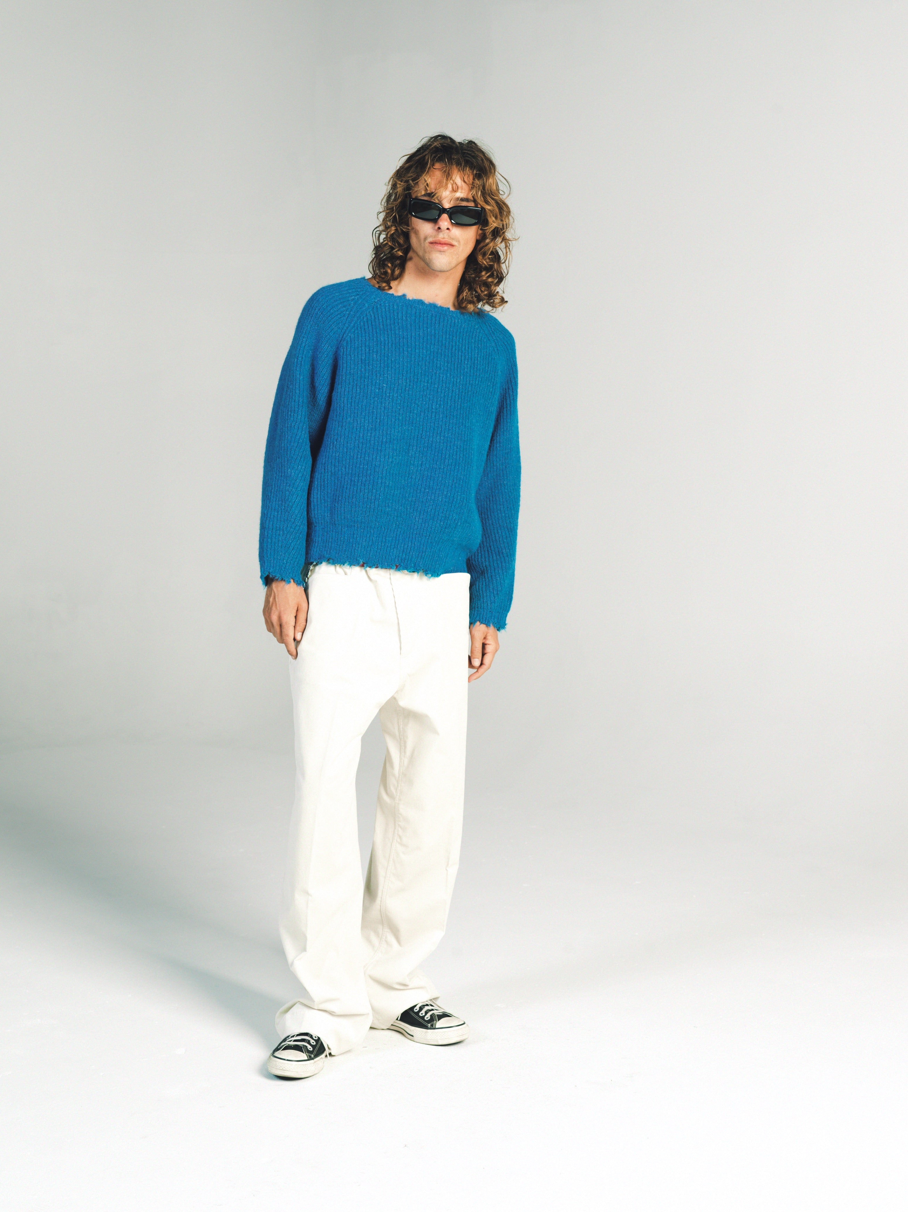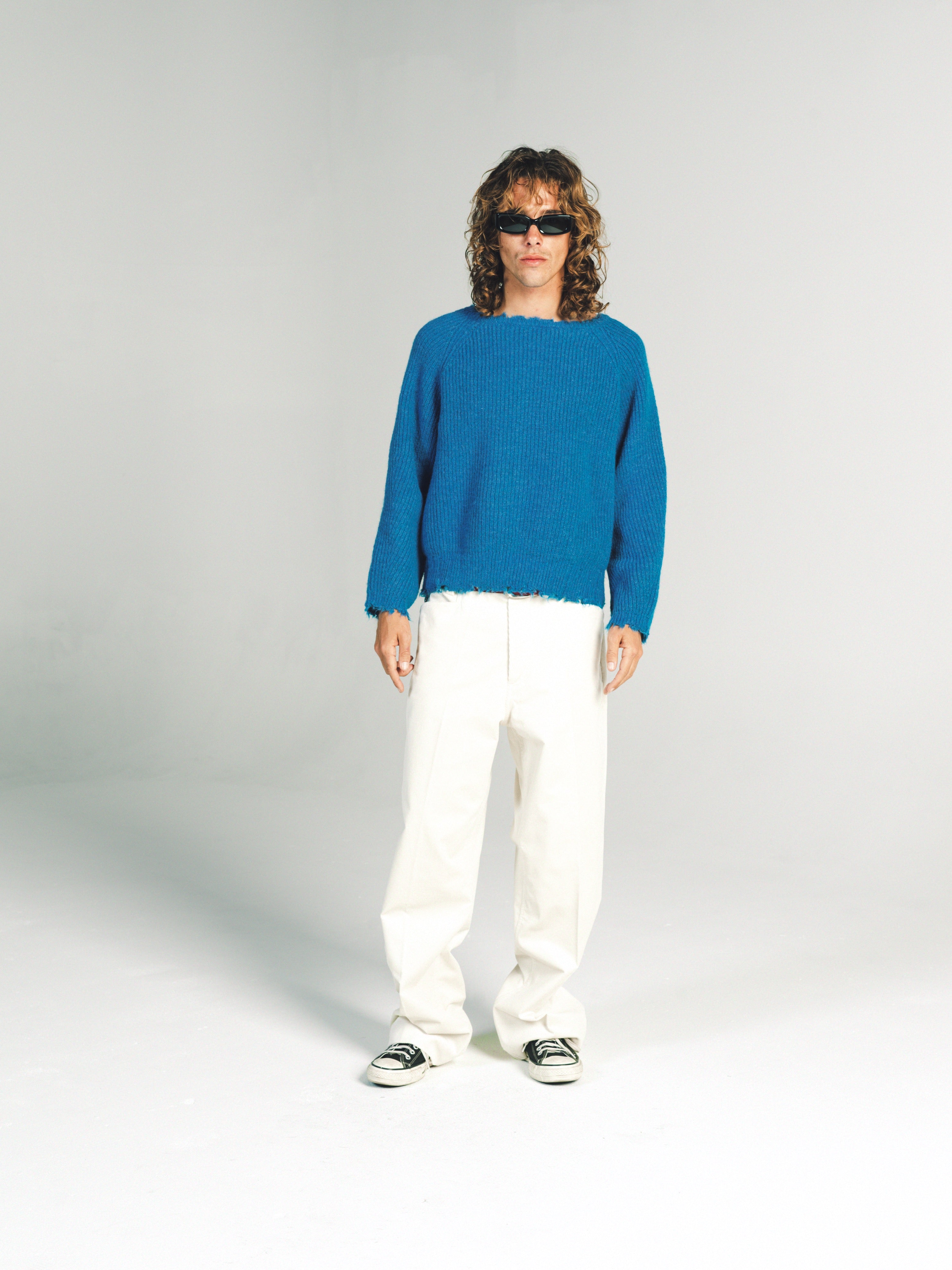 Pullover sweater, raglan sleeve, Destroyed ribbed neck, cuffs, and hem. Shrunken boxy fit. Heavy gauge knit to keep you warm. Model is 5'11 and wears a Medium. Dry Clean only! Take care of it by letting it air out on a hanger for 24hrs after wearing so it doesn’t collect all of your previous days odor. Nobody likes a stinky knit. After air drying don’t let it sit on a hanger for to long as you will get those weird hanger indents and it can stretch if hung for to long.