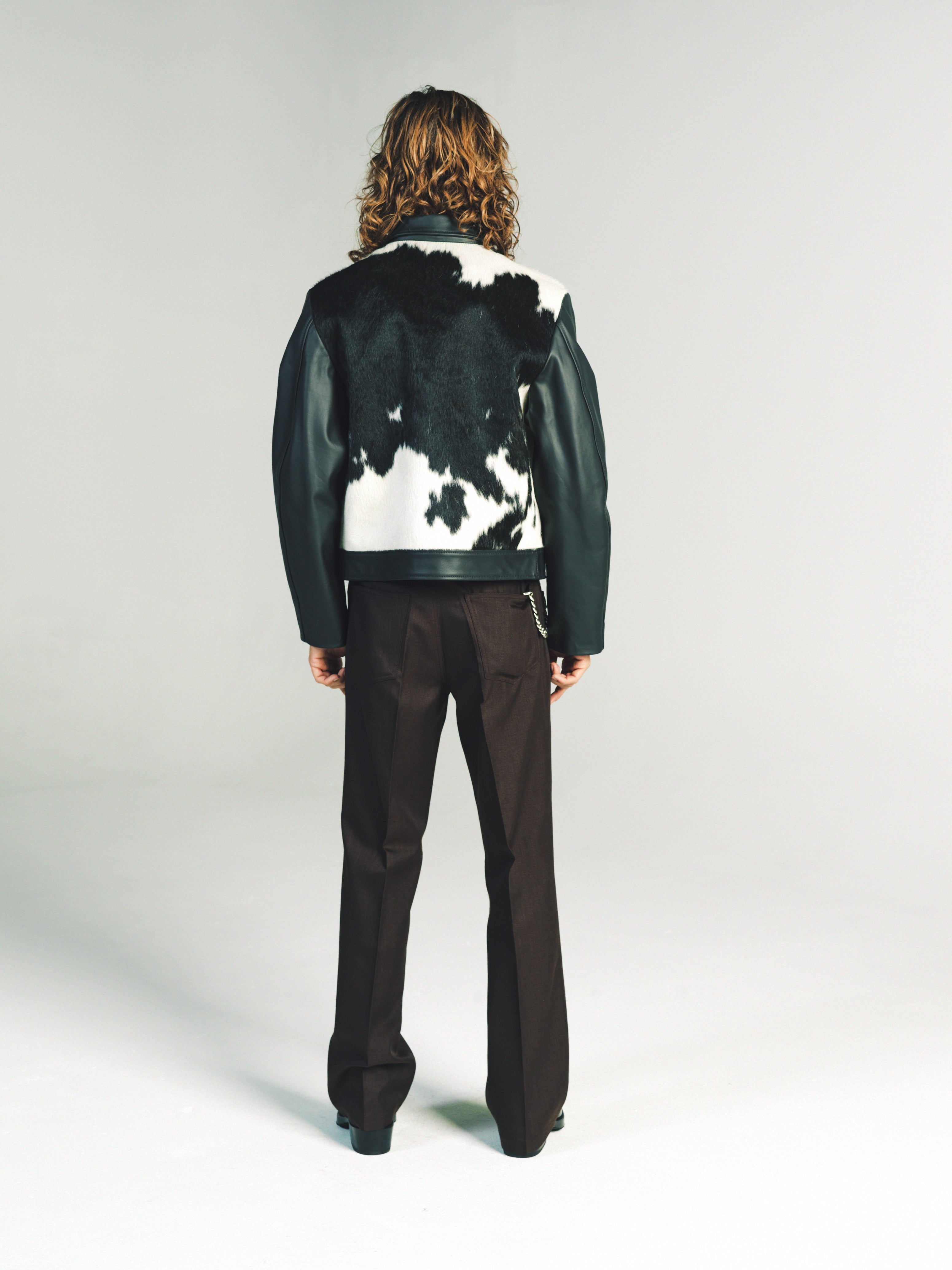 Two-way Zip front closure with front slash pockets. Classic Boxy fit zip up calf Leather jacket with cowhide front and back. Each piece will differ as the cowhides are all different. A true staple piece in any collection. Wear it in and it never wears out. Model is 5'11 ft. and wears a Sz. 48.