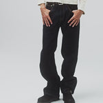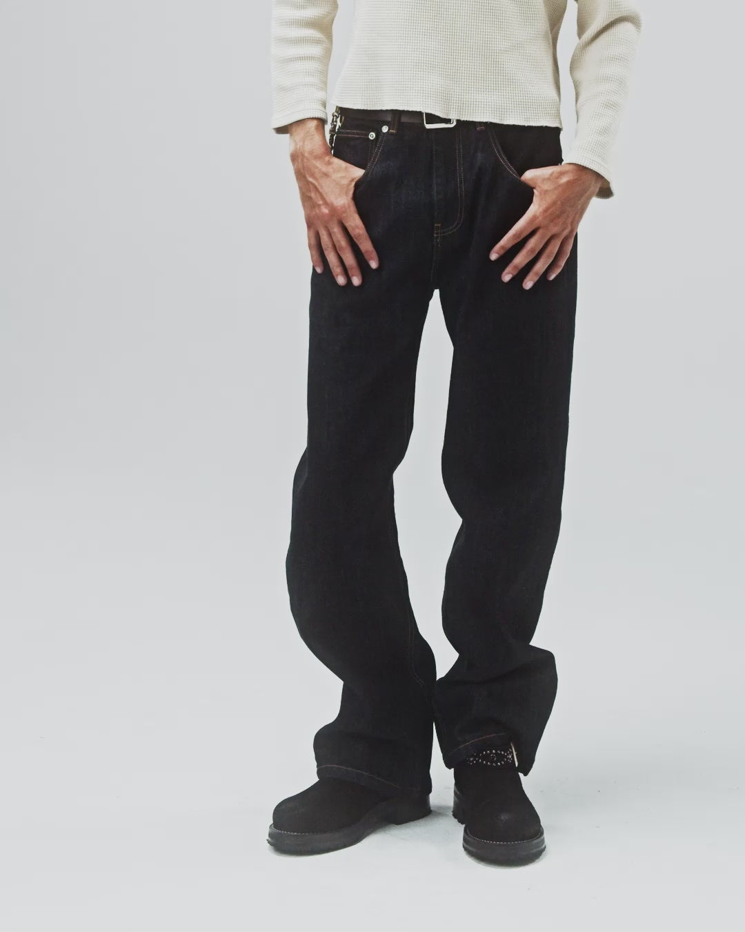 Relaxed classic fit Italian selvage denim pant. SECOND/LAYER branded waistband button shank closure, leather back patch, and zip fly, raw selvage indigo denim. Longer classic rise with a relaxed fit.