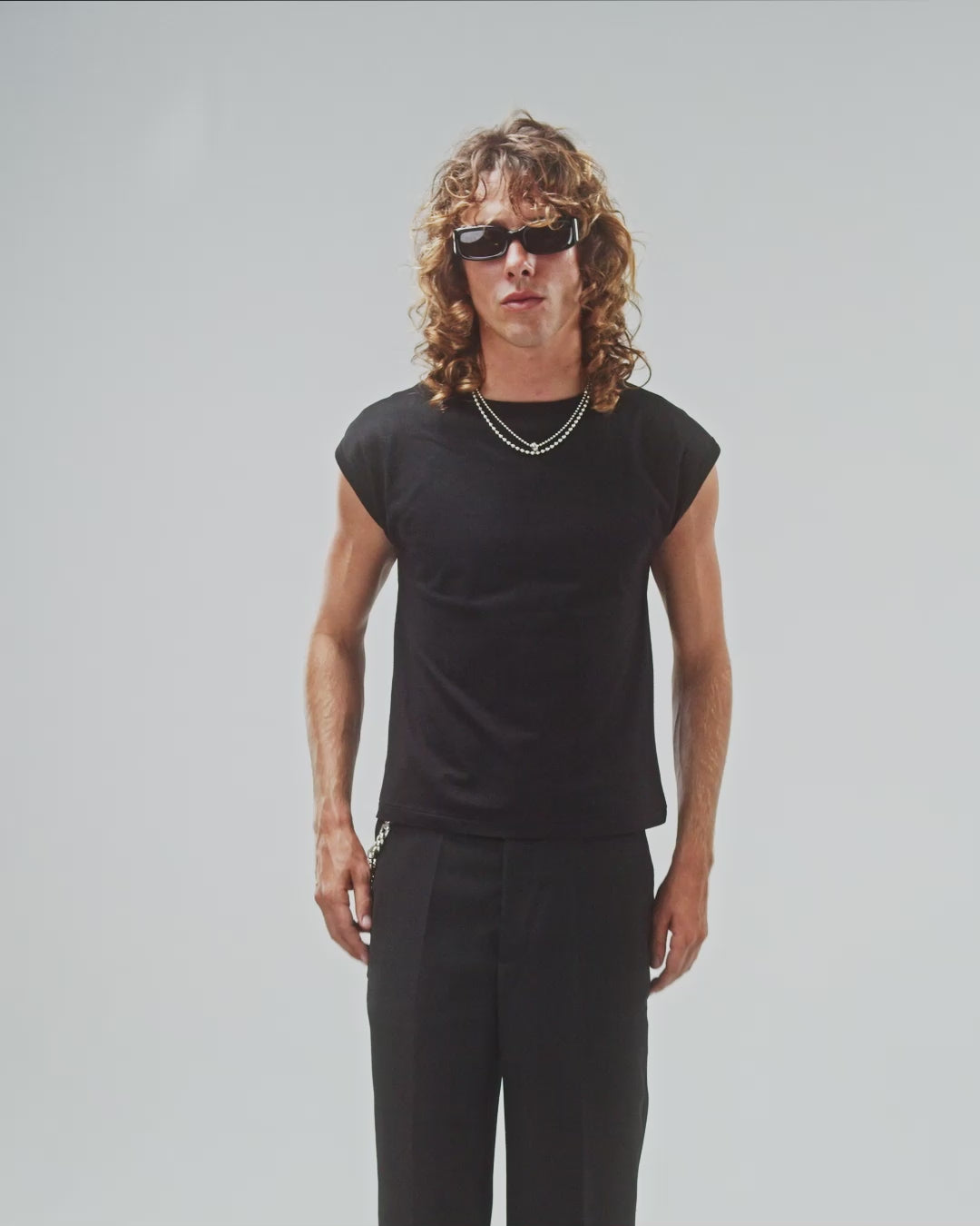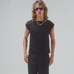 Mid-weight Japanese jersey. Slim tight fit. Capped sleeve. Think of every bad ass in a 70's movie. Don’t even think about it if your first layer isn't on point. Model is 5'11 and wears a sz. M.