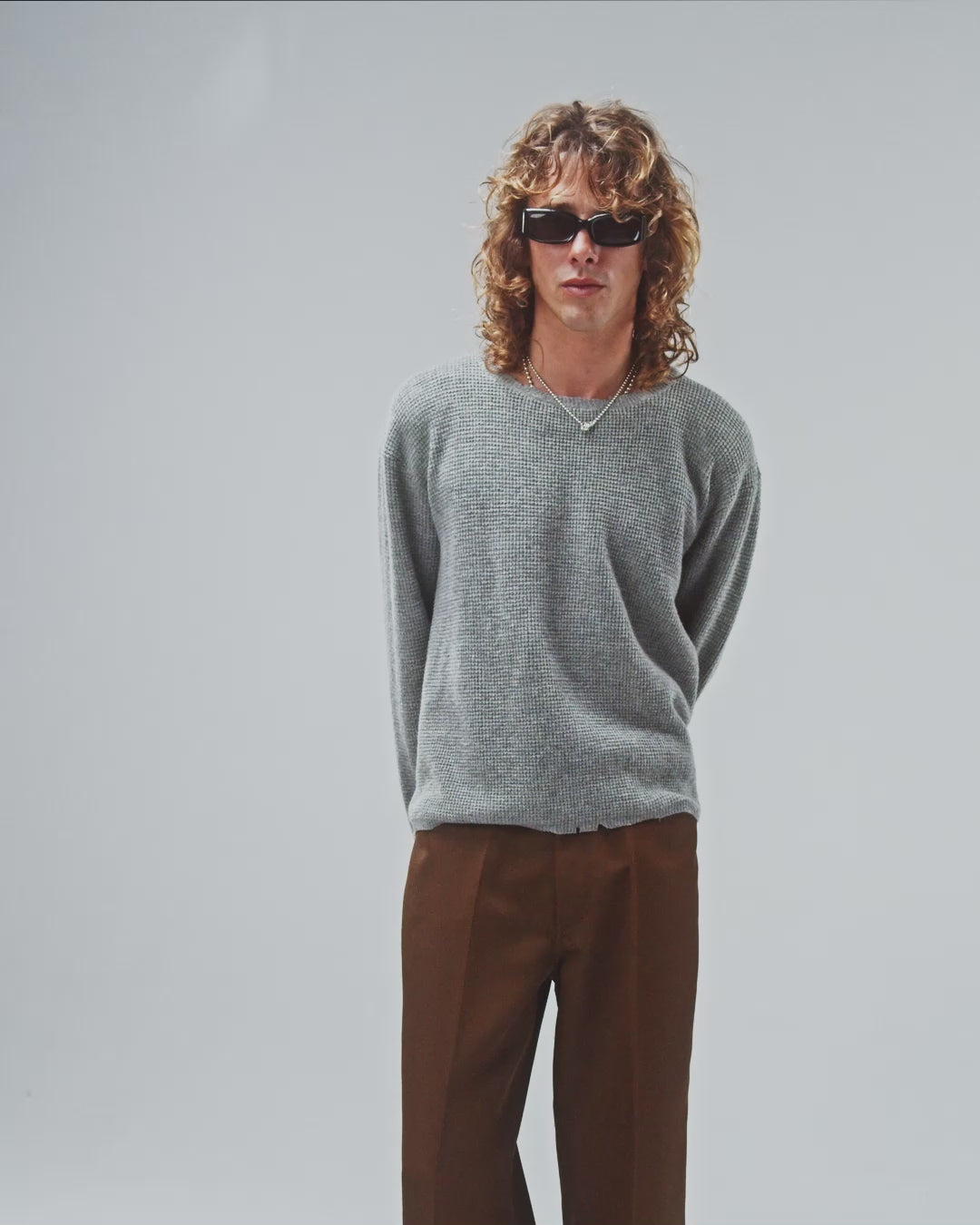 Relaxed cropped waffle knit pullover sweater in wool/cashmere blend yarn. Destroyed by hand to give a vintage look. Made in Italy.