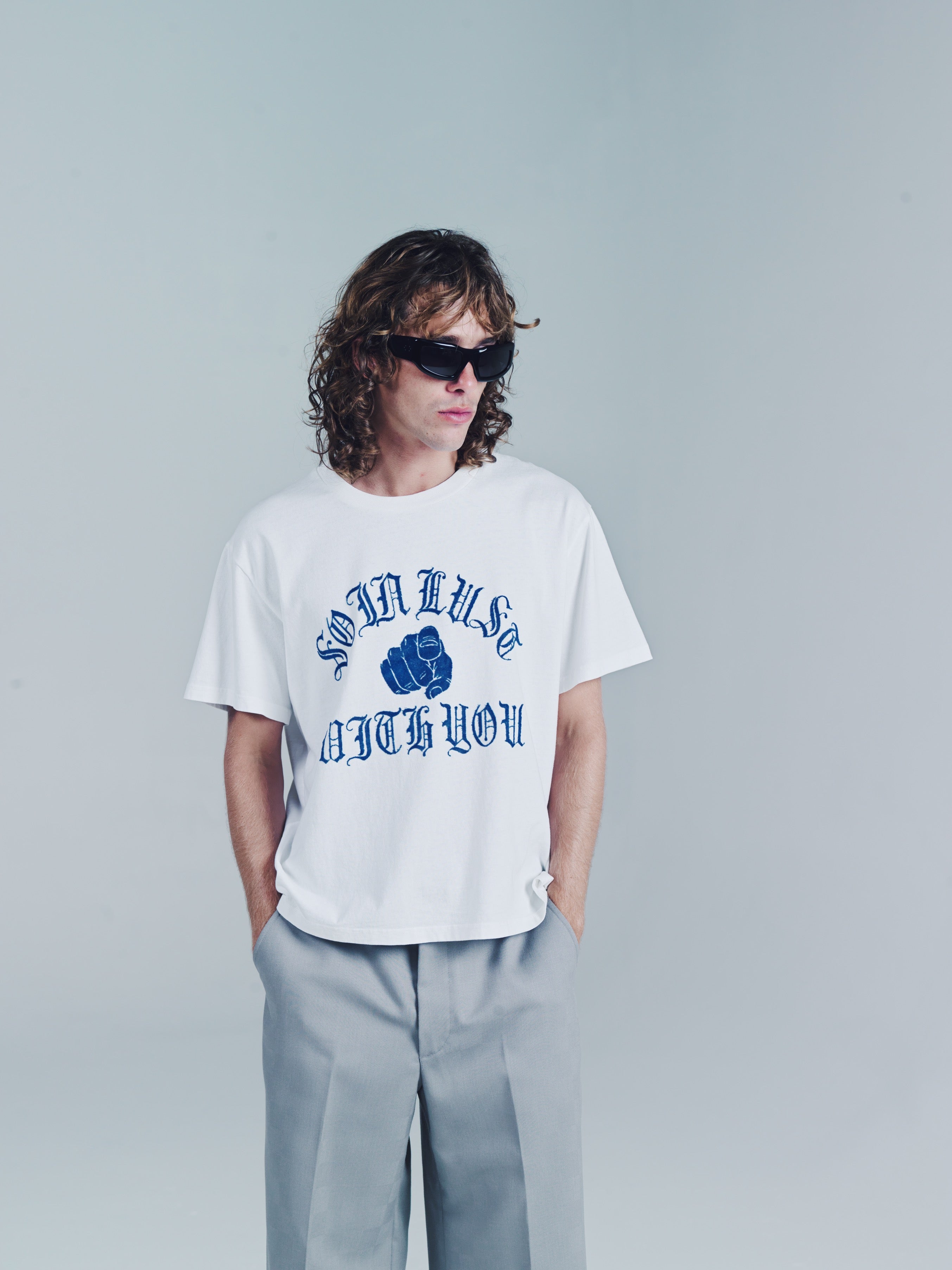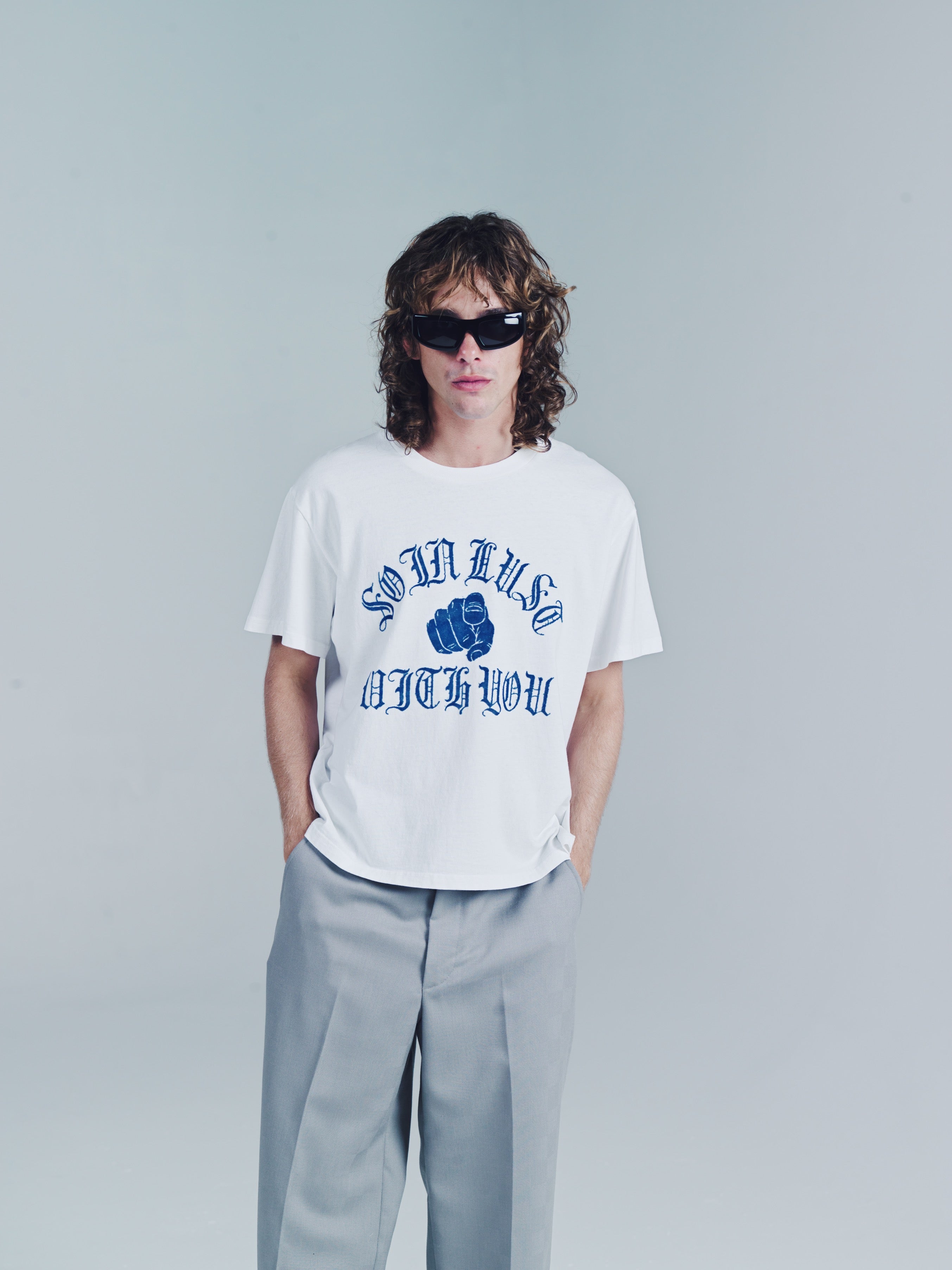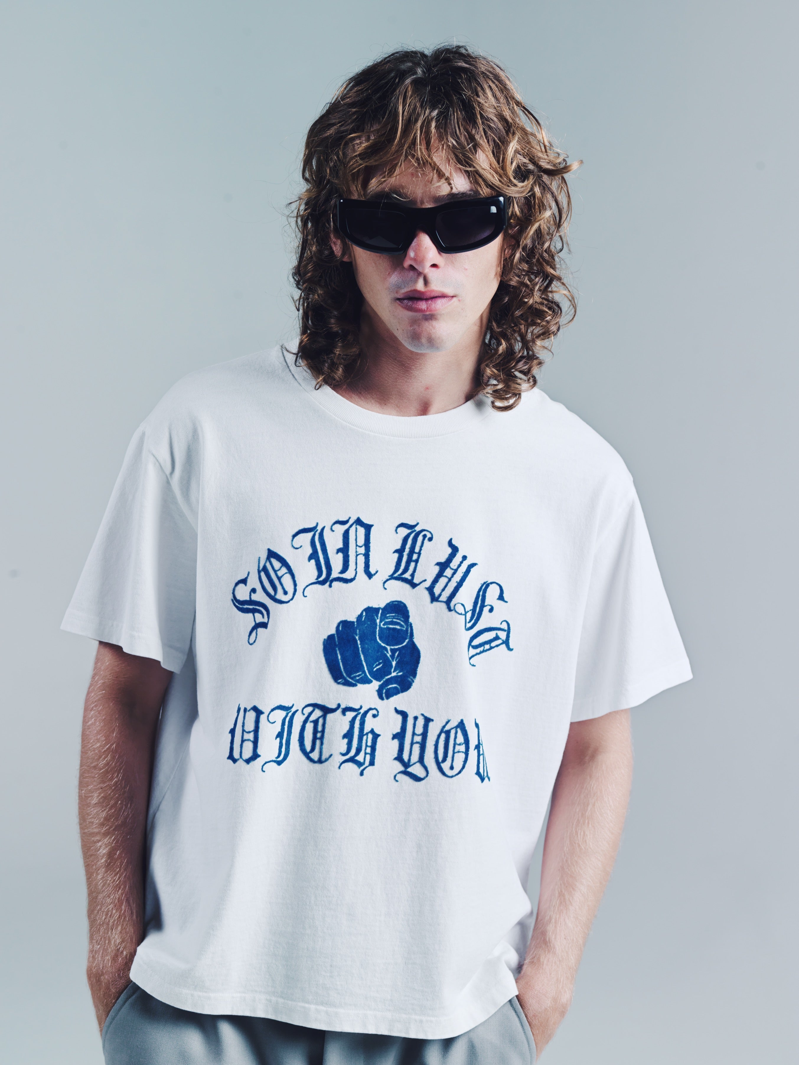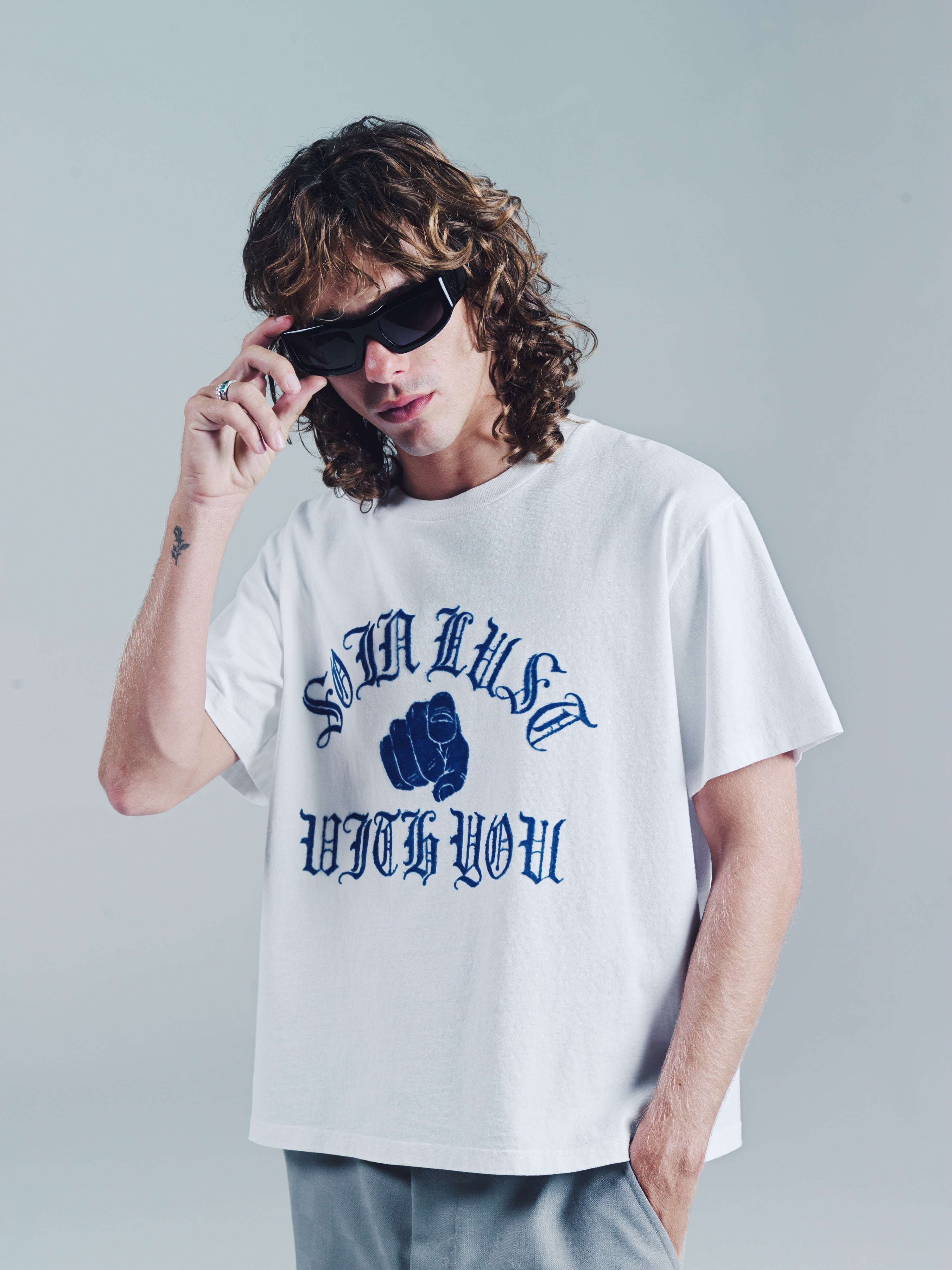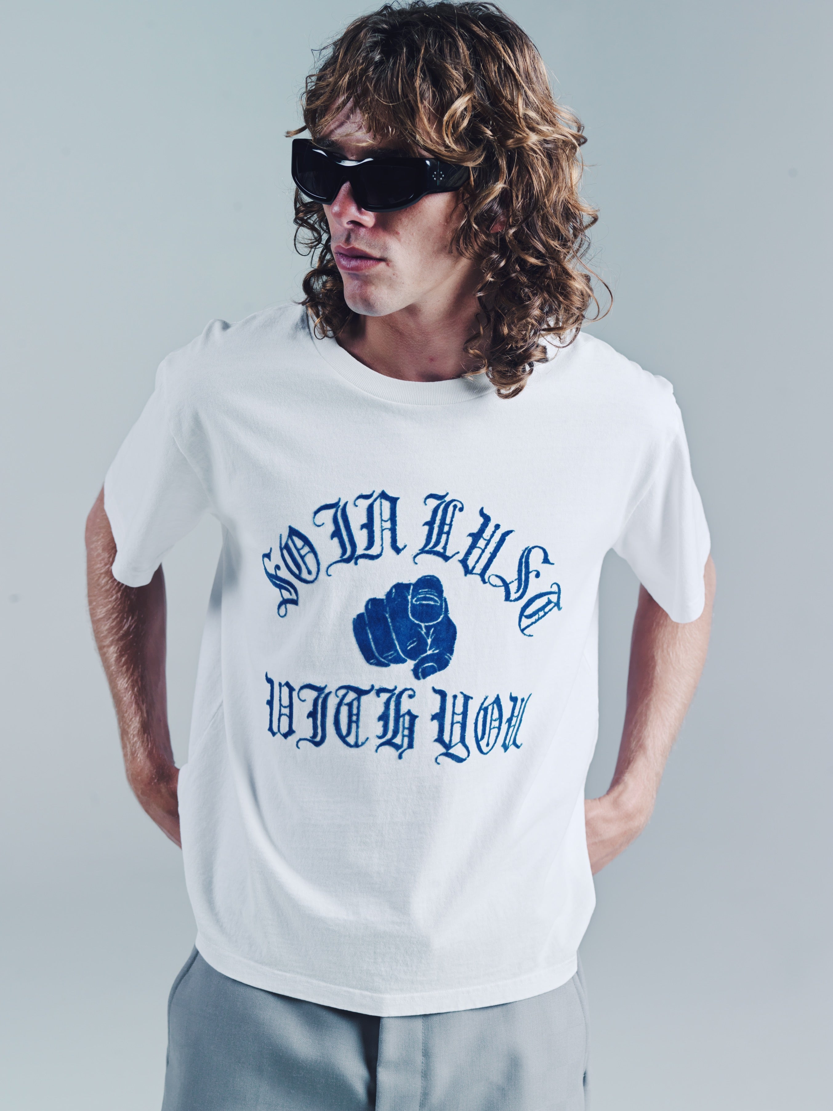 Ribbed Crewneck T-Shirt with "So in Lust with You" flocked graphic.A loose slightly cropped Tee. But that’s the point. Wear it how you like. Size up for a baggy fit or size down for a smaller fit. Model is 5'11 and wears a Medium. Made in Portugal. It’s a T-shirt. Don’t blow it. If you’re a baller you can dry clean. If you care then wash in cold and hang dry then iron. If Your lazy just wash and dry. Any is acceptable. Its up to you to care for your own shit