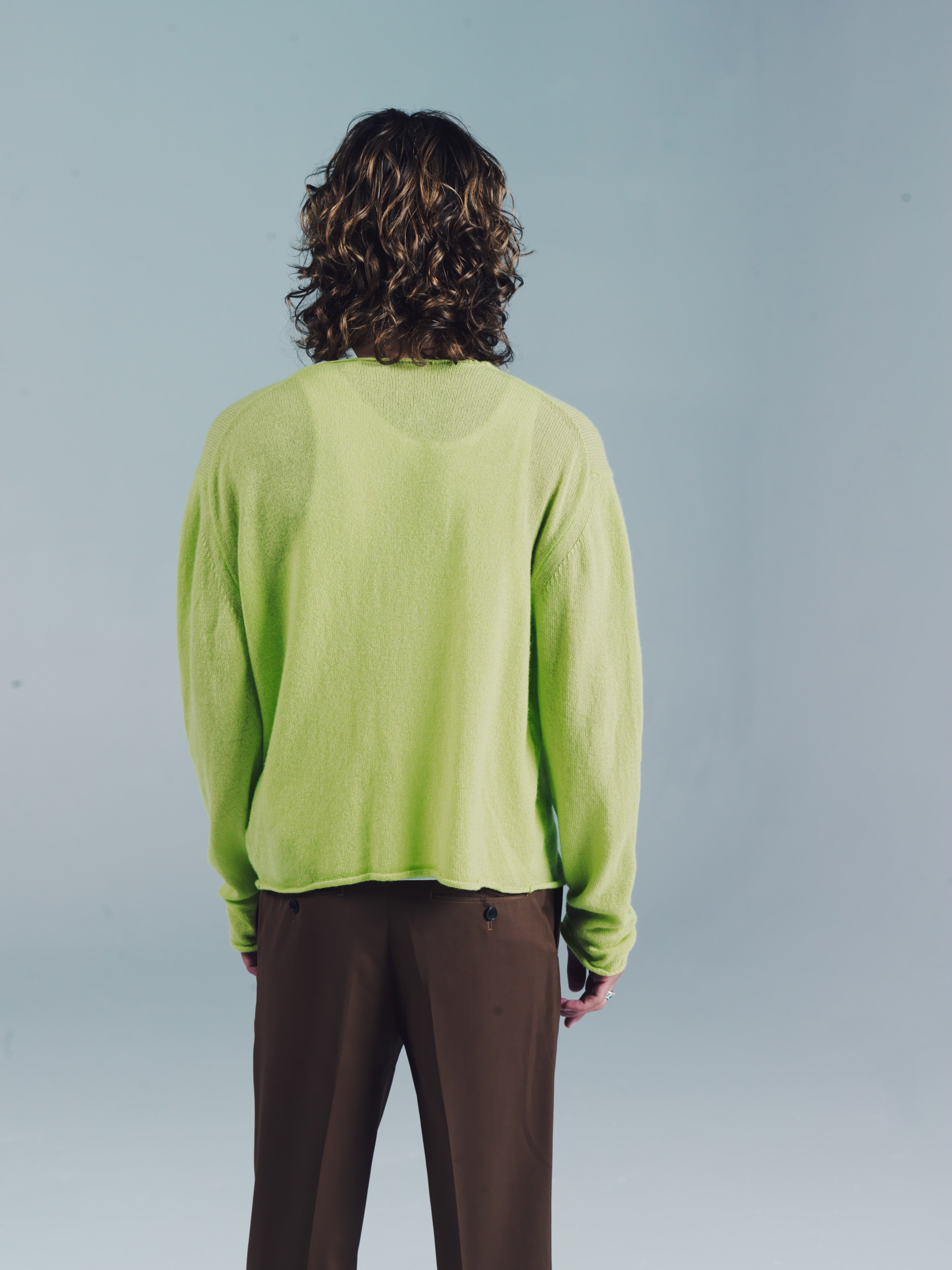 Button down knit crew collar sweater Raw edges at neck, hem, and sleeve hem. 100% Cashmere knit. Light weight knit with a slouchy look to be worn as a sweater over a vest either opened or closed. Works perfectly under a jacket as a layer. Just don’t let your girl take it. Consider it gone if that happens. Model is 6ft. and wears a Sz. M. Dry clean only. Don’t blow it. Act like you aren't brand new to this pimpin.